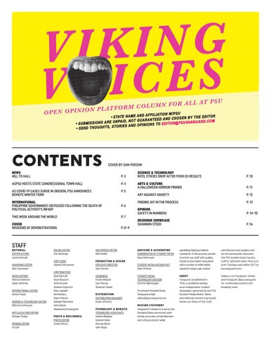 A DV ISING & ACCOUN TING COORDINATOR OF STUDENT MEDIA Reaz Mahmood STUDENT MEDIA ACCOUNTANT Sheri Pitcher STUDENT MEDIA TECHNOLOGY ADVISOR Corrine Nightingale To contact Portland State Vanguard, email editor@psuvanguard.com MIS SION S TAT EMEN T Vanguard ’s mission is to serve the Portland State community with timely, accurate, comprehensive and critical content while