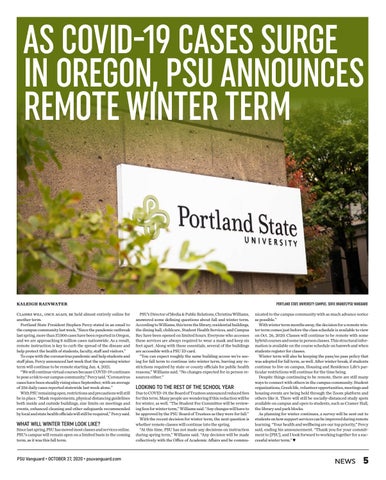 nicated to the campus community with as much advance notice as possible.” With winter term months away, the decision for a remote winter term comes just before the class schedule is available to view on Oct. 26, 2020. Classes will continue to be remote with some hybrid courses and some in person classes. This structural information is available on the course schedule on banweb and when students register for classes. Winter term will also be keeping the pass/no pass policy that was adopted for fall term, as well. After winter break, if students continue to live on campus, Housing and Residence Life’s particular restrictions will continue for the time being. Despite things continuing to be remote, there are still many ways to connect with others in the campus community. Student organizations, Greek life, volunteer opportunities, meetings and housing events are being held through the Zoom platform and others like it. There will still be socially-distanced study spots available on campus and open to students, such as Cramer Hall, the library and park blocks. As planning for winter continues, a survey will be sent out to students on how support services can be improved during remote learning. “Your health and wellbeing are our top priority,” Percy said, ending his announcement. “Thank you for your commitment to [PSU], and I look forward to working together for a successful winter term.”