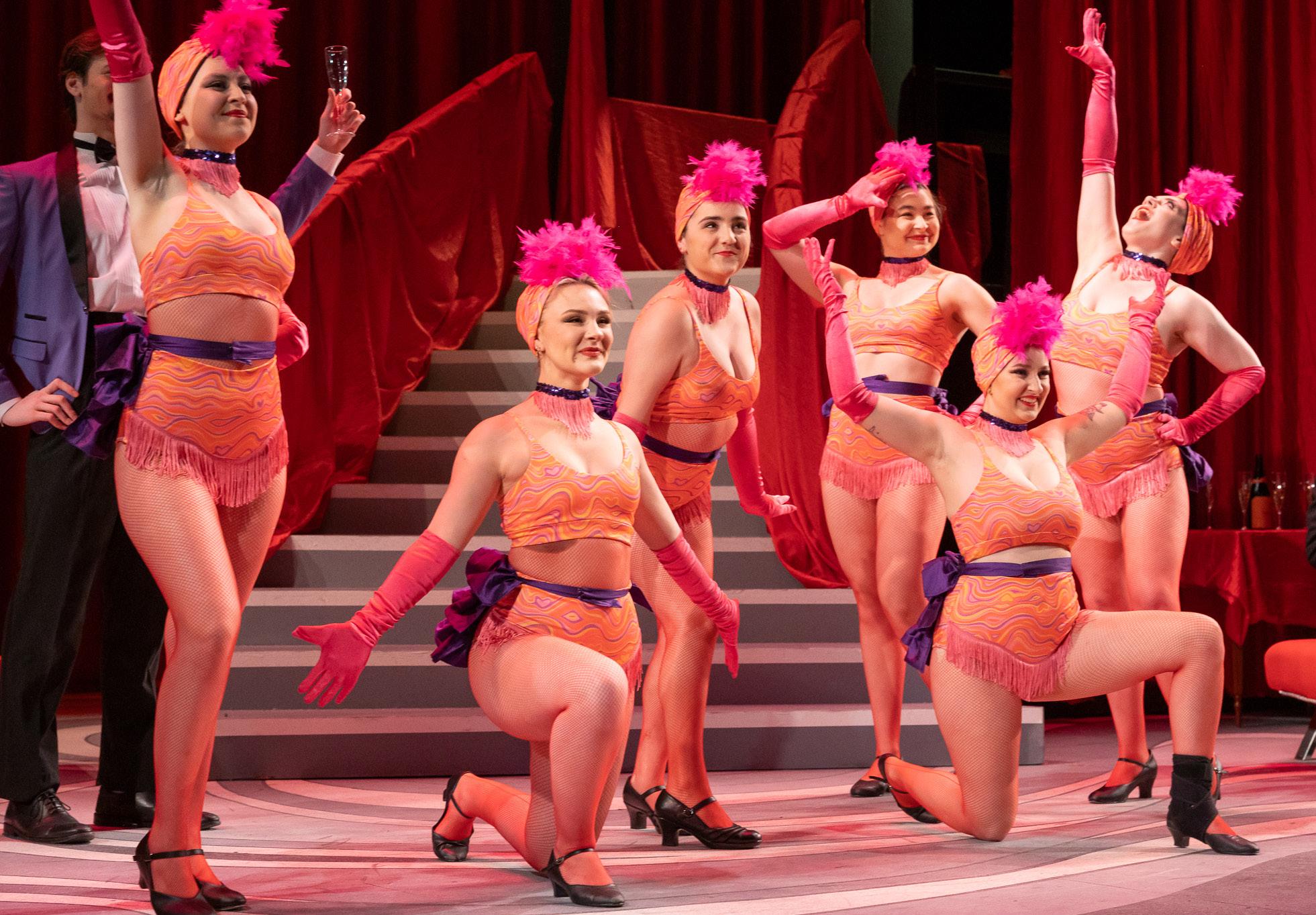 After the first act, the performers come out sporting a delightful costuming coup—gone are the gaudy ball gowns and on with the Jackie Kennedy-esque, short, A-line dresses and matching hats.
