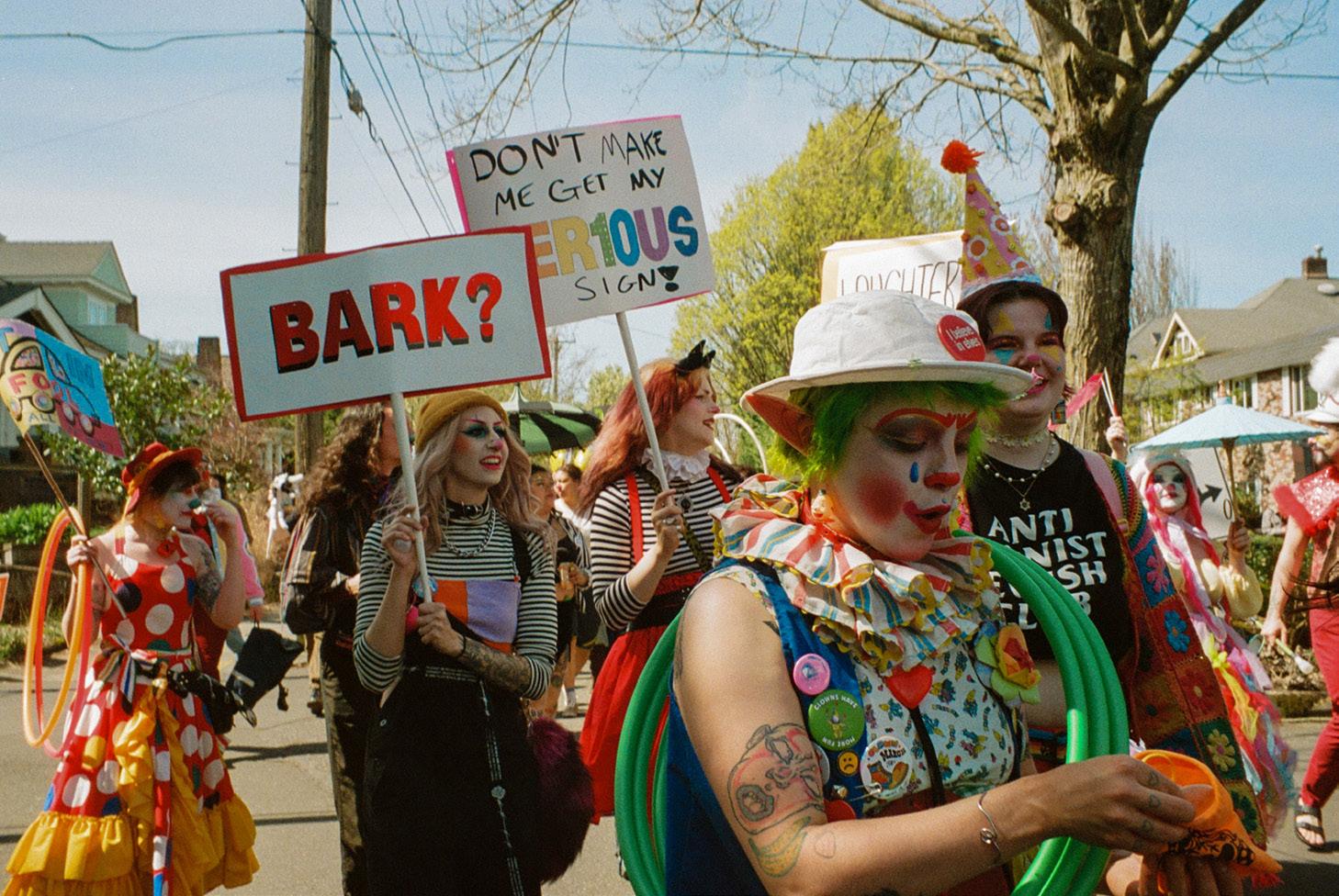 On April 5, a clowning collective known as—The April Fools—held their first official march through Portland’s Central Eastside. With the tagline “In Defense of Joy,” the central message behind the event puts happiness first, reminding Portlanders to maintain their wonder and whimsy despite current societal tensions. Clowns carried signs either showcasing zany quips or statements on positivity and hope.