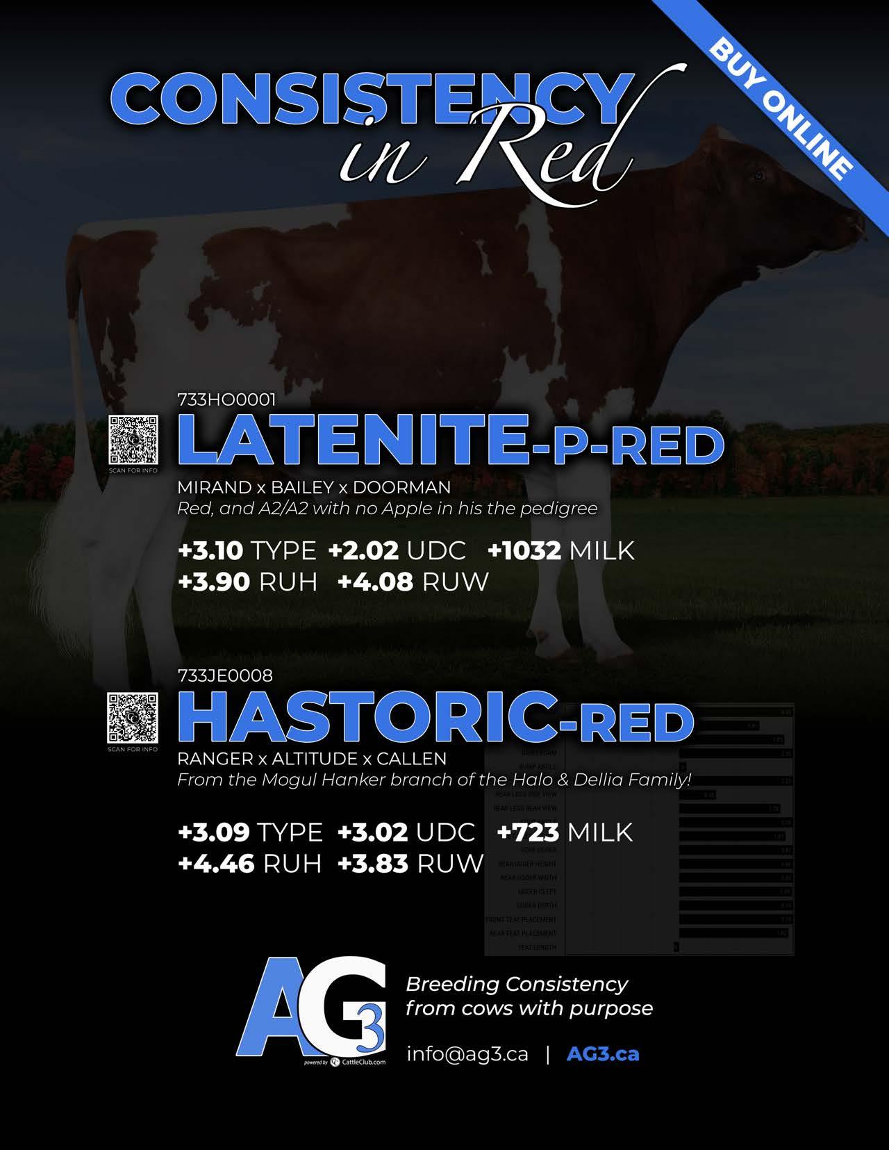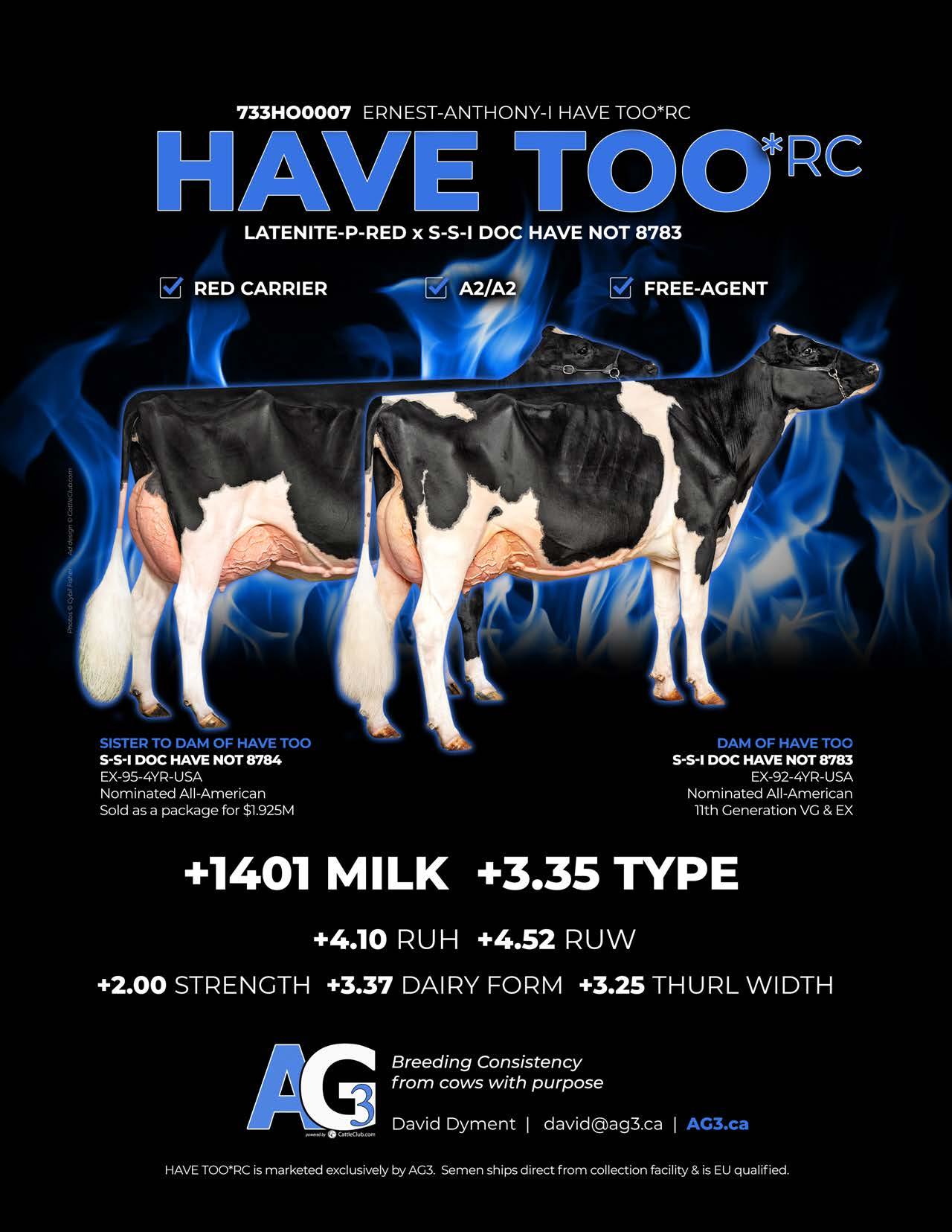 PEDIGREE INFORMATION: All production, classification, type and production summaries are current. Only official DHI or DHIR records are used in pedigrees contained herein. All records, except records in progress, are shown on true protein scale. Any production or classification records followed by a quotation mark (“) have been supplied by the seller or consignor. * indicates undesirable recessive carrier; *DP for dumps, *BL for blads, *CV for complex vertebral malformation, *BY for brachyspina and so forth.