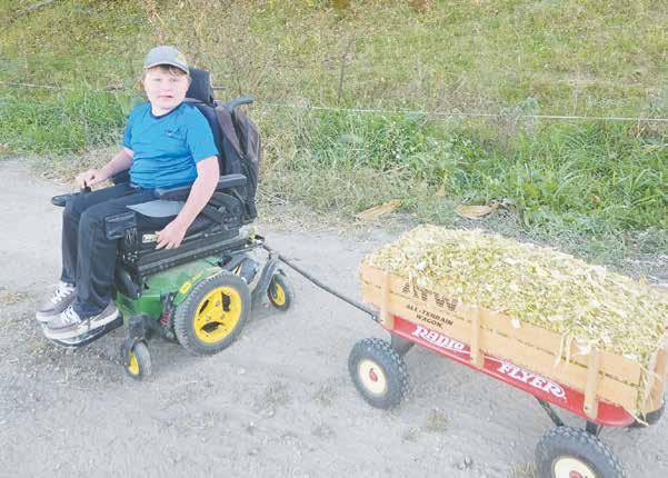 On Oct. 6, Evers Dairy got help with hauling corn silage. With the sun shining in the sky, one of the dairy’s CLAAS self-propelled choppers loaded a Radio Flyer coaster wagon pulled by a John Deere 4440-themed wheelchair. Driving was 9-year-old Memphis Franke. His parents, Kevin and Tracy, were on hand to video the scene.