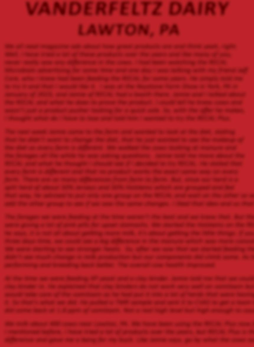 We milk about 400 cows near Lawton, PA. We have been using the RECAL Plus now for about a year and we highly recommend it. Like I men oned before, I have tried a lot of products over the years, but RECAL Plus is the rst product that I can honestly say has made a di erence and gave me a bang for my buck. Like Jamie says, go by what the cows say, THEY DON’T LIE!!!!