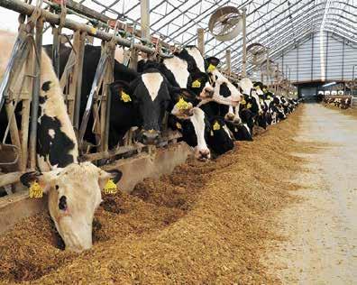 From a nutrition standpoint, no silver bullet perfectly combats heat stress. Benets can be seen by increasing certain minerals; potassium, sodium and magnesium contribute to an increase in dietary cation-anion difference levels in lactating dairy cows. Potassium is a primary regulator of water secretion from cows’ sweat glands and is secreted at high levels in milk. Research has shown feeding elevated DCAD levels during heat stress has resulted in improved milk yield and milk fat test. Researchproven additives to consider during periods of heat stress include additional buffers, salt, yeast, bypass fat, niacin, Rumensin® and Aspergillus oryzae.