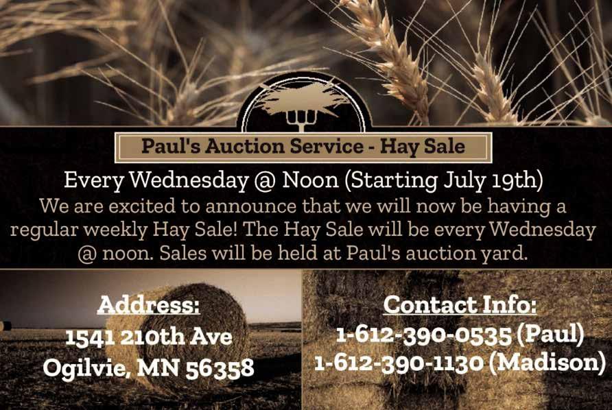 Page 18 • Dairy Star • Third Section • Saturday, July 22, 2023 Farmer’ s Market DAIRY FARMERS... Advertise your FARM-RELATED classi ed ad for free Mail or bring your ad to the Dairy Star, 522 Sinclair Lewis Ave. Sauk Centre, MN 56378 or e-mail: nancy.p@dairystar.com To guarantee ad placement, our deadline is the Friday before publication. Ads may be sent after that, but we cannot guarantee placement. (Payment must accompany ad unless prior arrangements are made. 25 word maximum.) Visa, MasterCard and Discover Accepted DAIRY STAR CLASSIFIED AD FORM NOTE: We make every effort to accurately advertise your item. Should we have any questions, please include your name and phone number where we can reach you: NAME PHONE FIRST 15 WORDS ARE FREE, $1.50 FOR EACH ADDITIONAL WORD. (Phone # and complete name count as one word each. Heading is not counted as a word.) (Ad Must Be Farm-Related--Call If You Have Any Questions) Non-Dairy Farmers & Ads For Real Estate, Business Services & Ads For Anyone Outside Our Circulation Area Are Charged $30.00 Per Issue LIMIT 1 FREE AD PER FARM PER ISSUE BUY • SELL • TRADE 8 DAIRY STAR USE ONLY: AUGUST AUCTION - Accepting Consignments Powers Auction Service 110 E Murray St, Browntown WI 53522 Office: 608-439-5760- Email: @ .com Website: www.powersauction.com -Facebook:PowersAuction Service Highway 64 Auctions Consignment Auction August 26, 2023 • Starting at 8:00 AM TIMED AUCTION: AUGUST 27TH - LOTS CLOSING AT 8:00 AM 5498 HWY 64, BALDWIN, IA 52207 • HWY 64 AUC TIONS OFFICE: (563) 673-6400 SCOTT FRANZEN: (319) 480-3604 • SHERI DOSLAND (563) 212-0453 HWY 64 AUCTIONS WILL BEGIN ACCEPTING CONSIGNMENTS AUG. 1ST! WE ARE LOOKING FOR QUALITY USED FARM EQUIPMENT Construction Equipment • Skid Steers • Attachments Hay & Forage Equipment • Planting & Tillage • Trucks • Trailers Lawn & Garden • Recreational Equipment and More! ONSITE & ONLINE BIDDING Visit Our Websites at www.hwy64auctions.com or www.powersauction.com for More Details and Information! August 19 - Last Day to Consign - noon August 26 - Hwy 64 Auction - Starts at 8:00 AM August 27 - Hwy 64 Timed Auction - Lots Start Closing at 8:00 AM Mark Your Calendars for Aug. 1st and Consign Your Equipment Early! CONSIGNMENT HOURS Mon. -Fri.: 8 AM – 4PM Saturdays: 8 AM - noon Closed Sundays No late consignments will be accepted Do you enjoy working in a fast-paced environment where you are challenged to excel and grow your skills? Our company currently works on Apple based computers and utilizes Adobe software. General agricultural knowledge is preferred. This is a full or part time position. If you are interested in looking at this position we would love the opportunity to meet with you. All applications are kept con dential. Please submit resumes to: 522 Sinclair Lewis Ave., Sauk Centre, MN 56378 or e-mail to nancy.p@dairystar.com Graphic Designer Wanted ST R Publications Dairy Star | Benton Ag | Benton County News | Classy Canary | Country Acres Sauk Centre Herald | Sauk Rapids Herald | Star Post | Star Shopper Star25-tfn