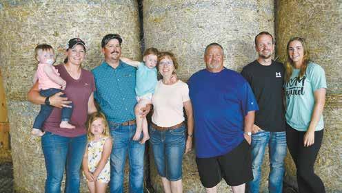 The Udermann family — Kirsten holding Aubrey, Kallie, Alex holding Zoey, Mary Lou, John, Jake and Sam — gather in their hayshed July 15 at their farm, Meadowbrook Dairy Inc., near Sartell, Minnesota. The Udermanns milk 80 cows in a estall barn.