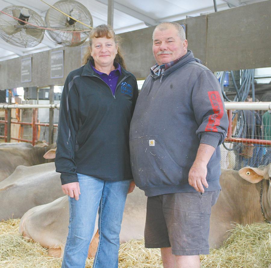 Deanna (le ) and Dale Bendig take a break from chores Oct. 3 at World Dairy Expo in Madison, Wisconsin. The two have worked together for nearly 35 years to build and develop their successful farm and boarding business in Ge ysburg, Pennsylvania.