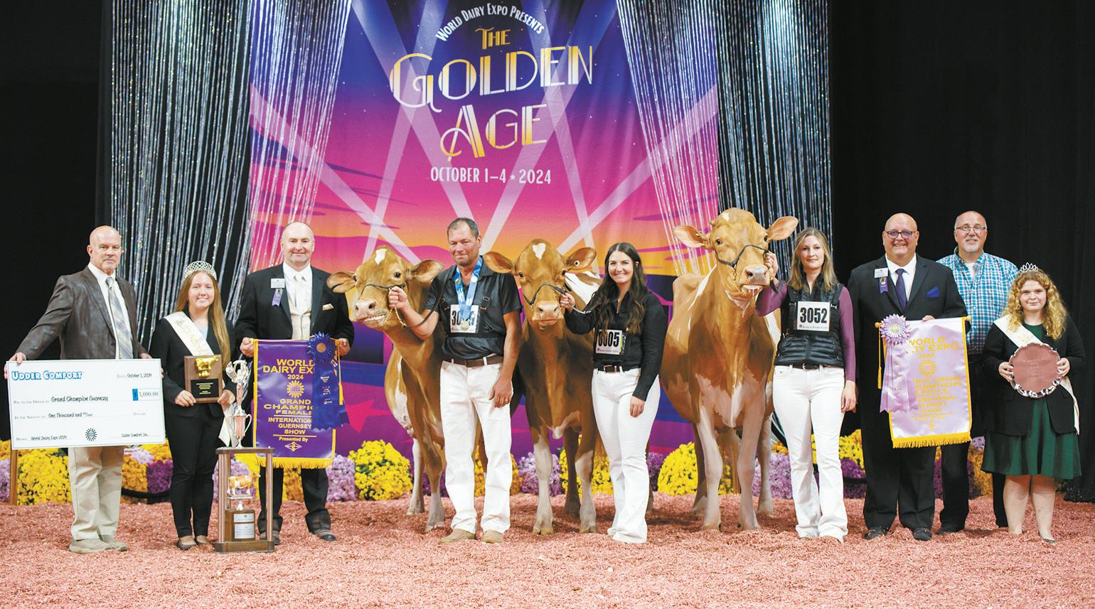 Springhill Kojack Uno-ETV is named Senior and Grand Champion of the Interna onal Guernsey Show a er winning the Aged Cow Class Oct. 3 at World Dairy Expo in Madison, Wisconsin. Uno is owned by Melander, Robthom and Smith-Crest. Prairie Gem JD Lincoln-ETV, the winning Senior Two-Year-Old, is named Intermediate and Reserve Grand Champion. Lincoln is owned by Glamourview Farms. Knapps Digligle Qualitys Queenie, the winning Five-Year-Old, is named Reserve Senior and Honorable Men on Grand Champion.