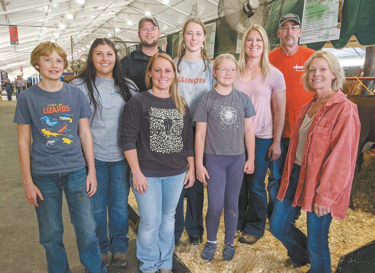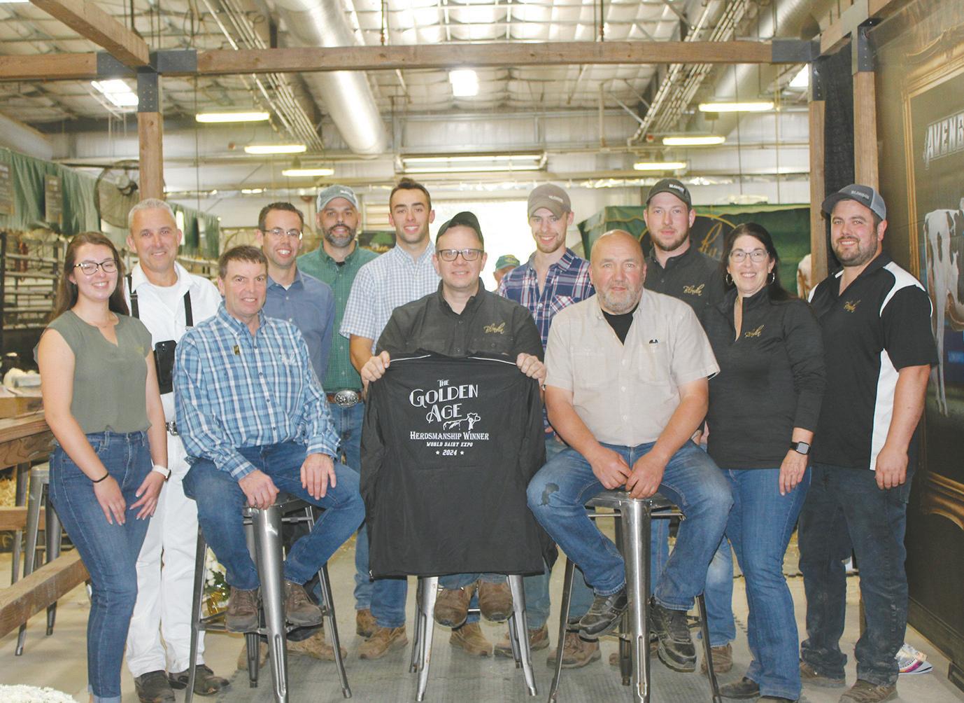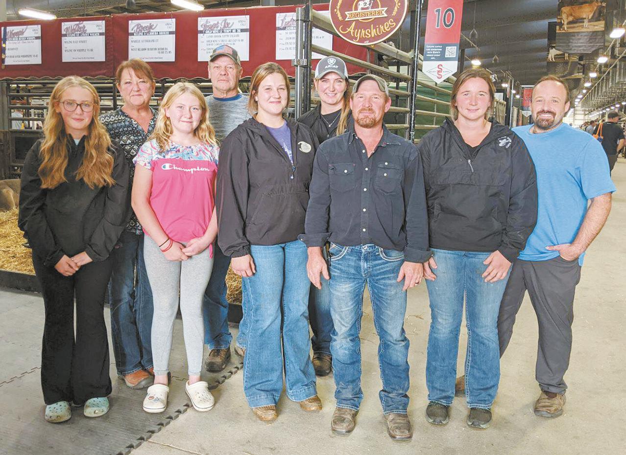 Myline Ayrshires, represented by Lili Williams (front, from le ) Ava Williams, Carli Reeverts, Brad Kinney, Amy Hughes; (back from le ) Diane Mosher, Joe Gibbs, Jody Nus and Harold Deering, receive the Pavilion 2 Zone 2 Herdsmanship Award Oct. 3 at World Dairy Expo in Madison, Wisconsin. Myline Ayrshires is in Durand, Illinois. Not pictured is Jill Kinney.