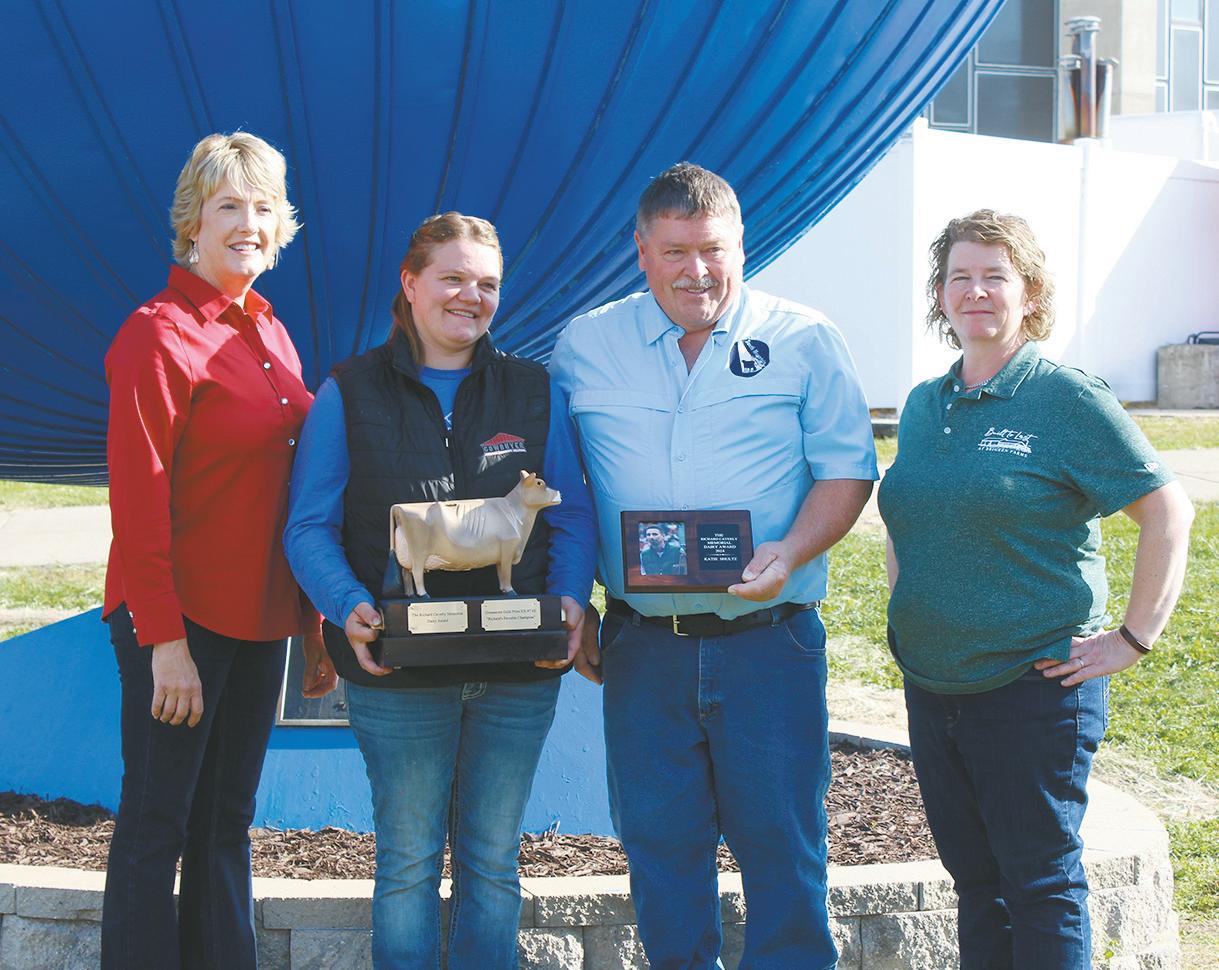 The team from A-Joy Swiss — Rick Kruse (from le ), Brock Champluvier, Allie Champluvier and Andrew Evans — celebrates receipt of the Tent 2 Zone A Herdsmanship Award Oct. 3 at World Dairy Expo in Madison, Wisconsin. A-Joy Swiss is located in Rome, Pennsylvania.