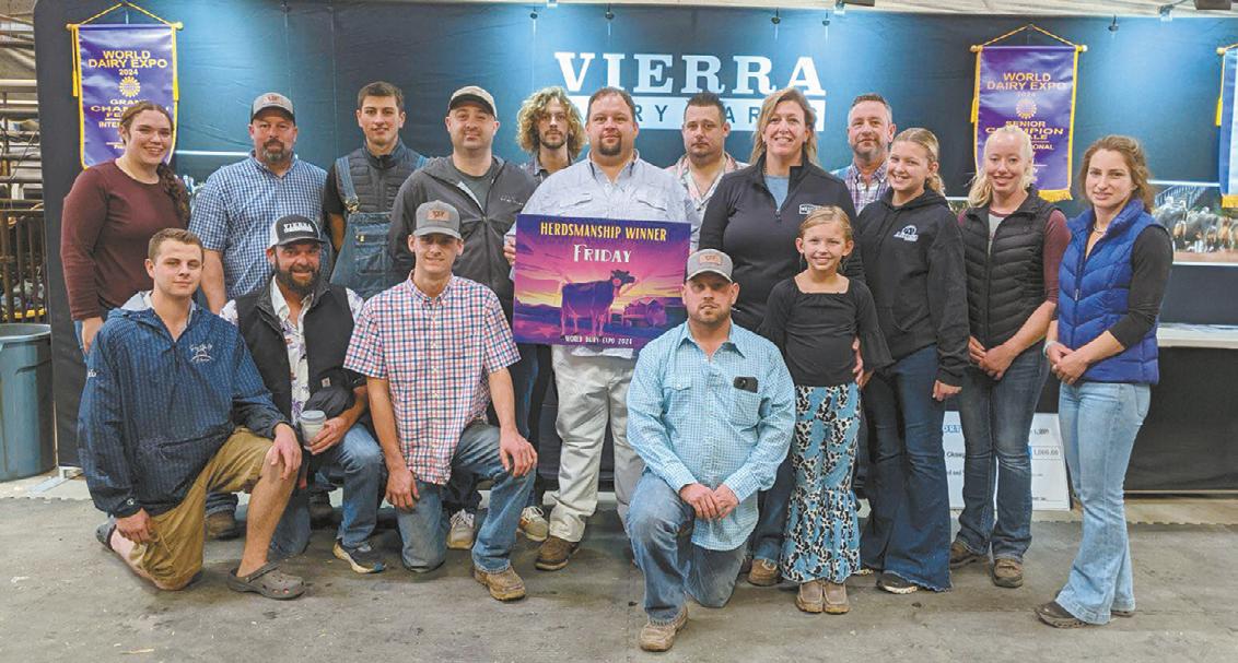 The crew from Springhill —Ben Simpson (front, from le ), Marshall Overholt and Micah Musser; (back, from le ) Eldon Hershberger, Georgia Herne, Kayla Overholt, Sami King and Carly Plocher —are the proud winners of the Pavilion 2 Zone 1 Herdsmanship Award Oct. 3 at World Dairy Expo in Madison, Wisconsin. Springhill is located in Big Prairie, Ohio.