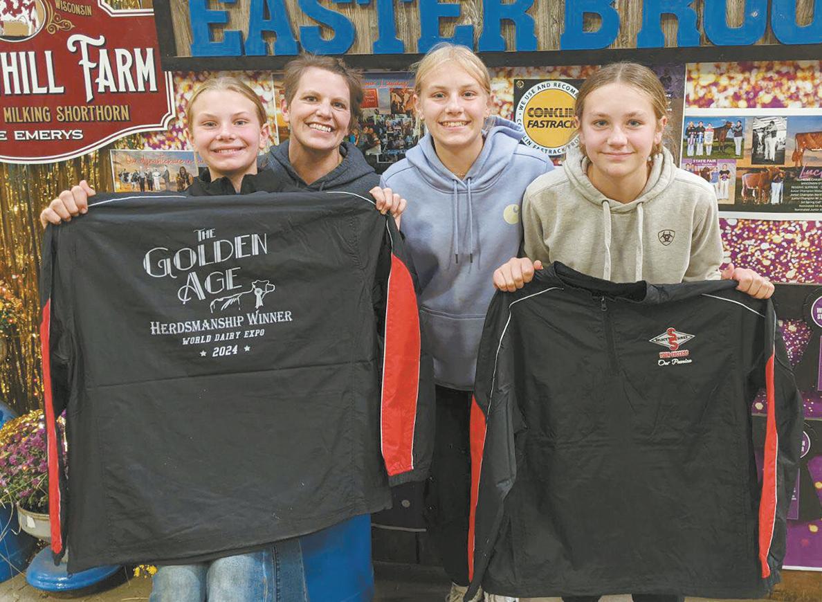 Brenda Damrow-Gudex (from le ) and her daughters, Macyn, Madison and Mackenzie, accept the Pavilion 2 Zone 4 Herdsmanship Award for Easter Brook and Vallowhill Farm Oct. 3 in Madison, Wisconsin. Easter Brook Farm is located in Juneau, Wisconsin and Vallowhill Farm is located in Sullivan, Wisconsin.