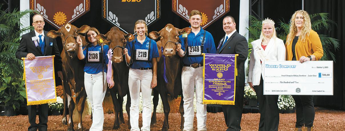 Heavenly Zora-ET is named Senior and Grand Champion of the Interna onal Junior Milking Shorthorn Show Oct. 5 a er winning the Five-Year-Old Class at World Dairy Expo in Madison, Wisconsin. Zora is owned by Dillon Freeman, of Bremen, Indiana. Lazy-M-JK Lady-in-Red-EXP is named Intermediate and Reserve Grand Champion a er winning the Junior Three-Year-Old Class. She is owned by Aubree, Aiden and Alaina Topp, of Botkins, Ohio. Corstar Mixin-It-Up-EXP-ET P is named Reserve Senior and Honorable Men on Grand Champion a er winning the Four-Year-Old Class. She is owned by Cadence Spearman, of West Concord, Minnesota.
