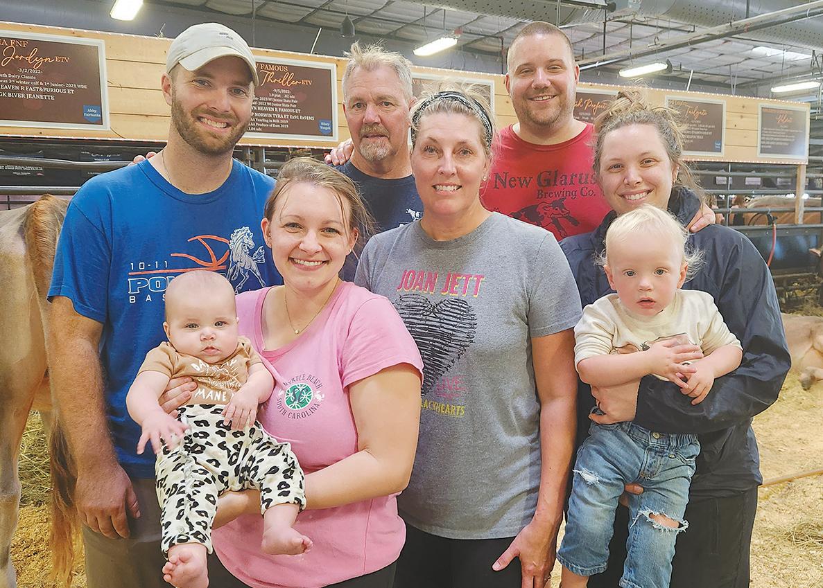 The Voegeli family — Hilary Voegeli (front, from le ) holding Vera Voegeli, Carrie Xander and Brienna Voegeli holding Nolan Bohl; (back, from le ) Chris Voegeli, Bryan Voegeli and David Bohl — take a break Oct. 1 by their string of Brown Swiss ca