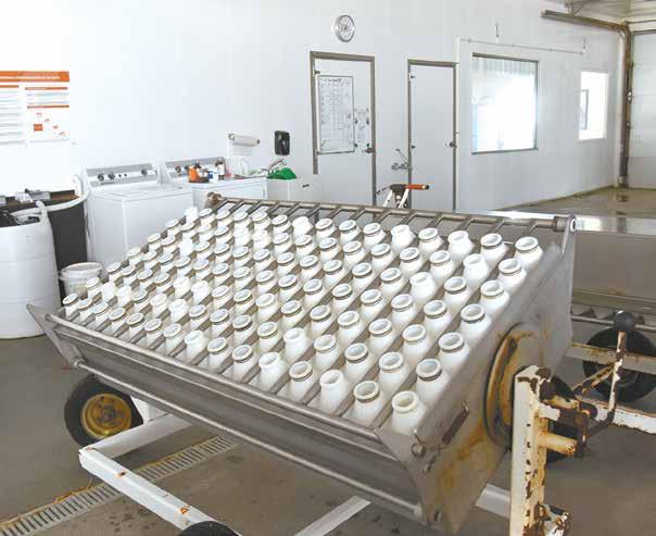 All the calves receive pasteurized milk until they are weaned. The milk is pasteurized in a separate building near the calf barns. Here there are wagons that hold 105 bottles.