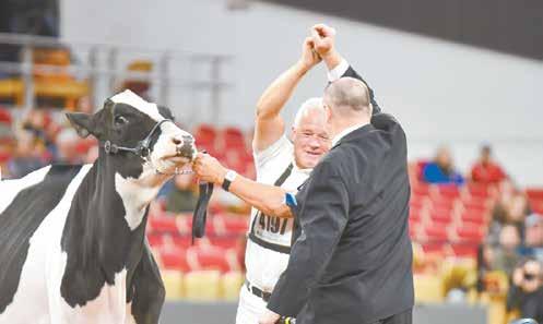 Tyler Doiron embraces Erbacres Snapple Shakira a er she claimed her second championshiptle of the Interna onal Holstein Show Oct. 6, 2023, at World Dairy Expo in Madison, Wisconsin. Shakira went on to claim her second supreme championship tle later in the day.
