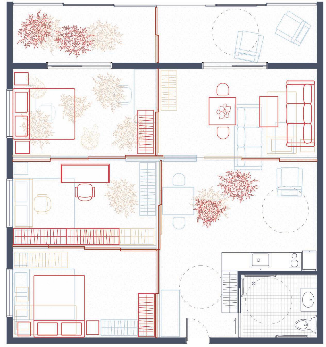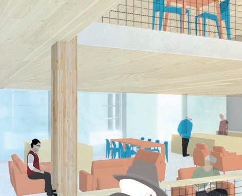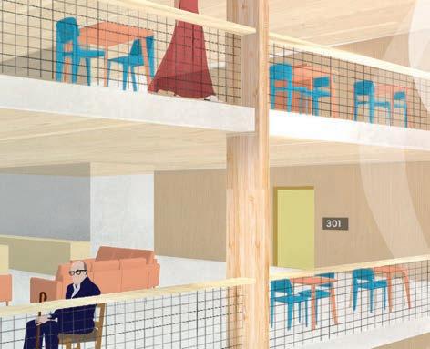 The community centre program provides arts and recreation spaces geared towards people of all ages, fostering intergenerational learning. The residential block is equipped with shared amenities to support a co-care model of living. Units are designed for seniors to age in place, employing a panelized interior partition system and adjustable furniture to meet seniors’ unique preferences and mobility requirements. At all scales, the agency of the residents is supported by community presence.