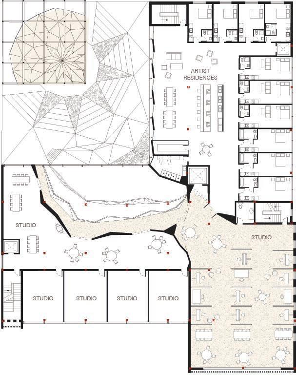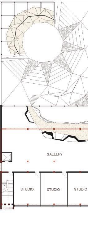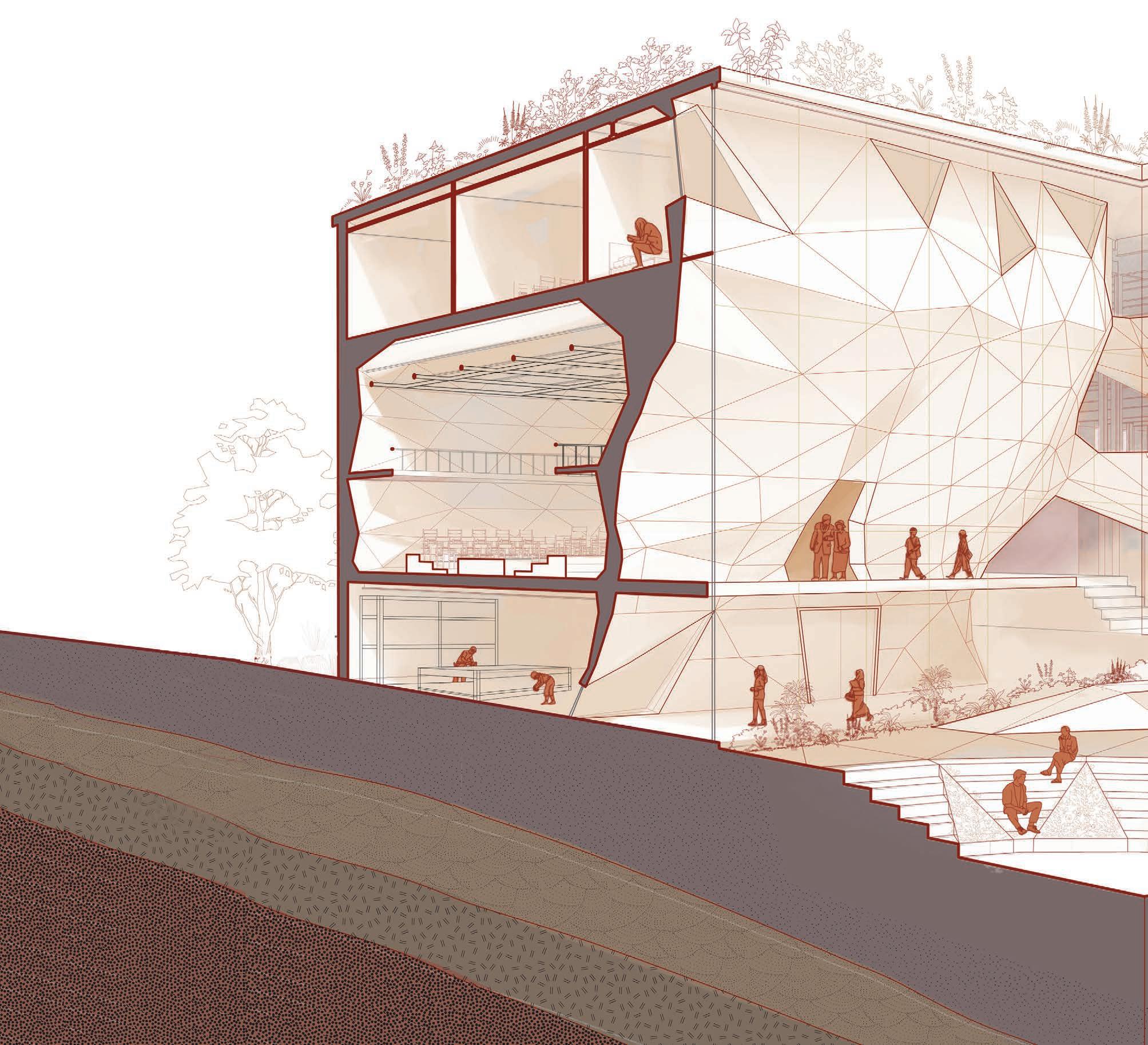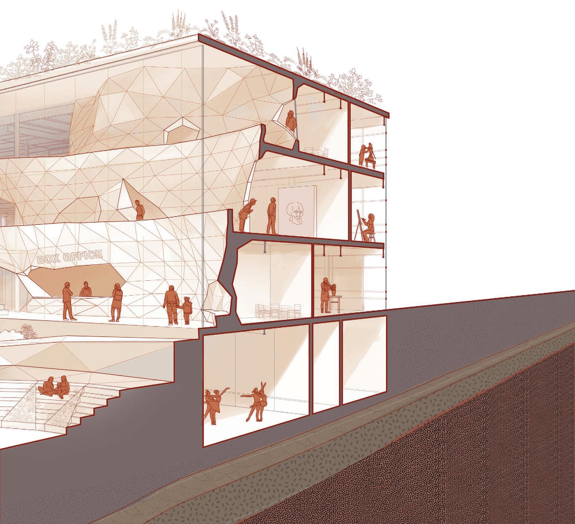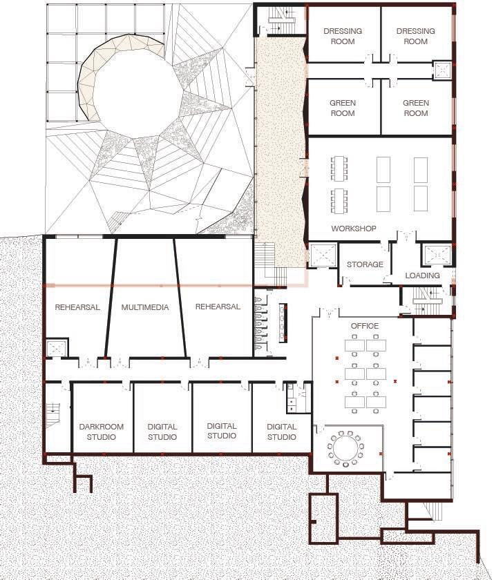 The rocky interior terracing defines the main gallery and performance spaces. Its triangulated surface enhances acoustics and creates openings into studios and galleries to foster public engagement. The art centre turns the rigidity of the police station into open organic sculpture, providing visually and acoustically dynamic spaces to support the creation and appreciation of art.