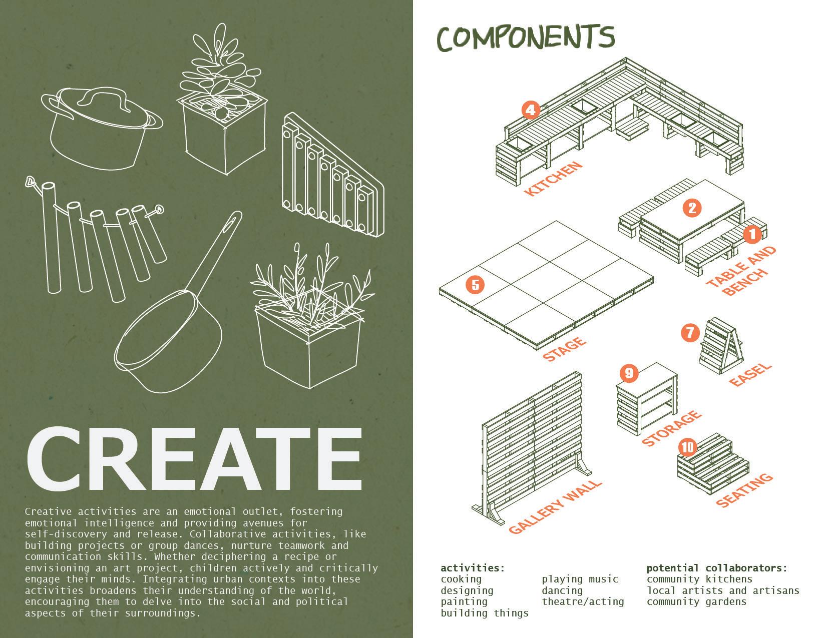 - older children may be able to use tools independently or with guidance from peers, while younger children may participate more through the arrangement and customization (i.e. painting) of the components.