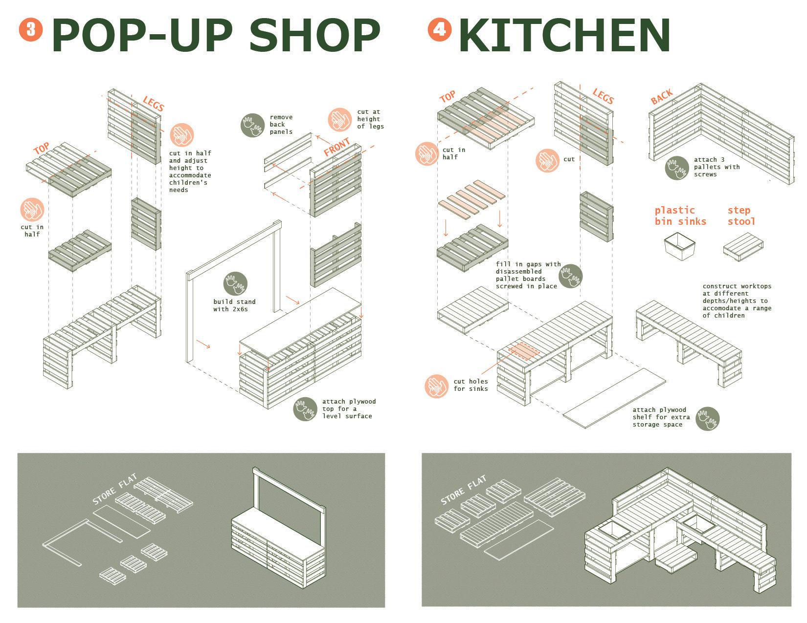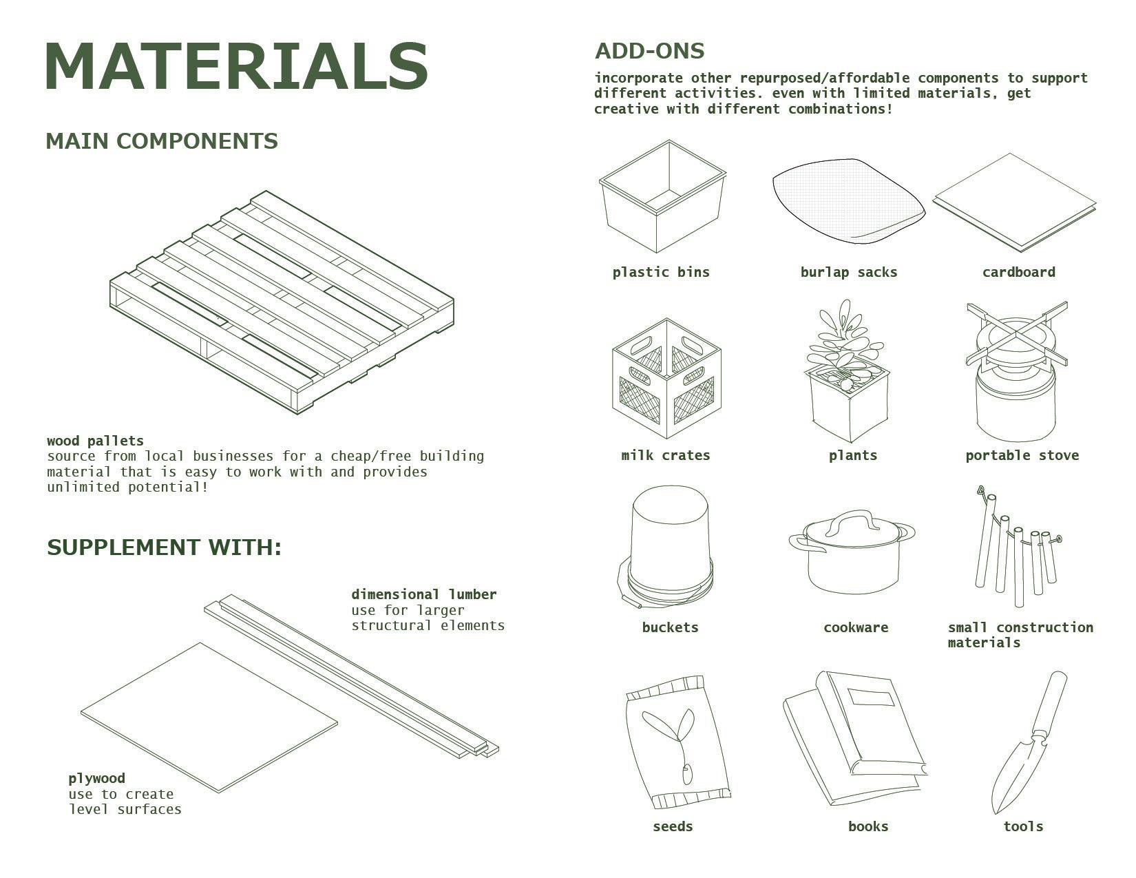 Pallets are the primary construction material for components, as they are easily assembled/ deconstructed/reused.