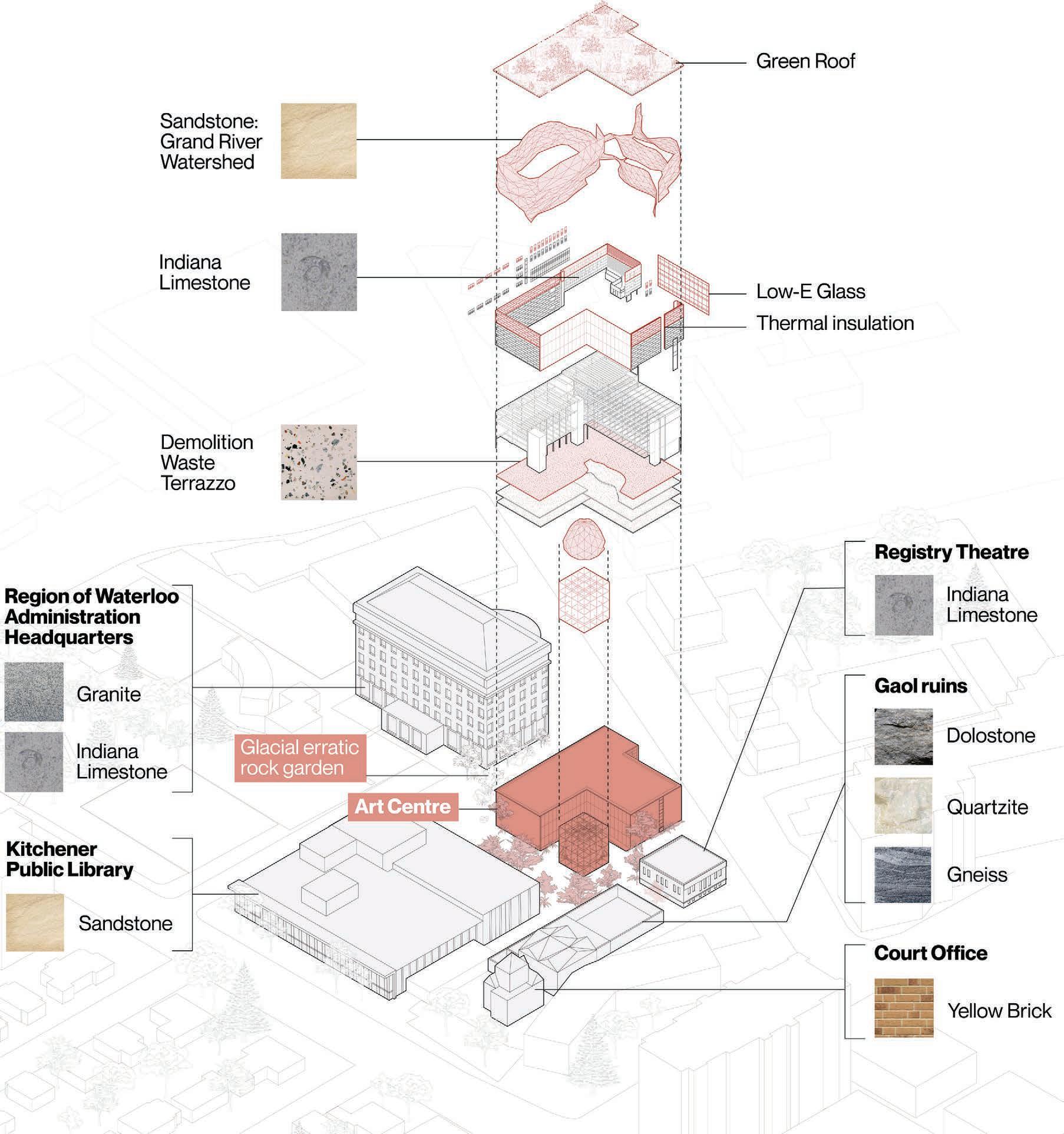 The rock form acts as a parasite, breaking open the old police station to invite public interaction and reconnect it to the land. The materials of the building share similar characteristics with the glacial erratics and local stone found in the Grand River Watershed.