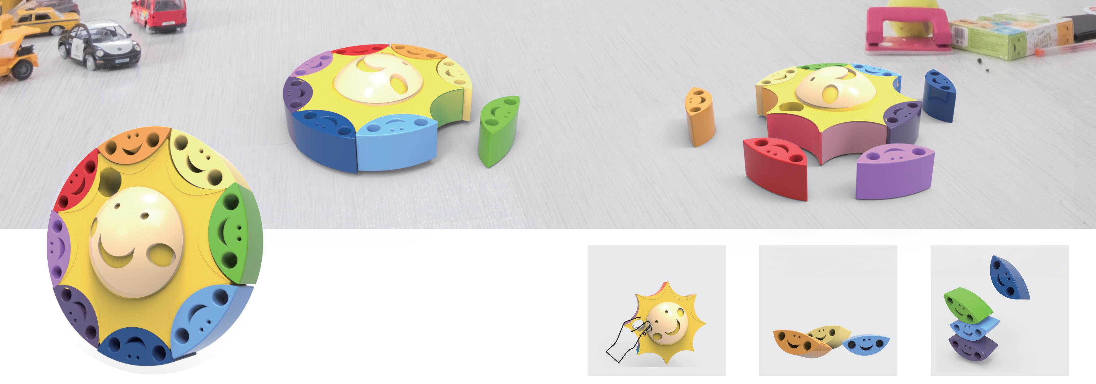 把顏色、形狀、聲音 三種最基本的感官認知帶入玩具 中,太陽每個側面都用不同顏色做區分,搭配不同顏 色的笑臉積木,讓寶寶學習顏色的配對,在遊戲的過 程中,也能從搖擺的笑臉積木中學習到平衡技巧。