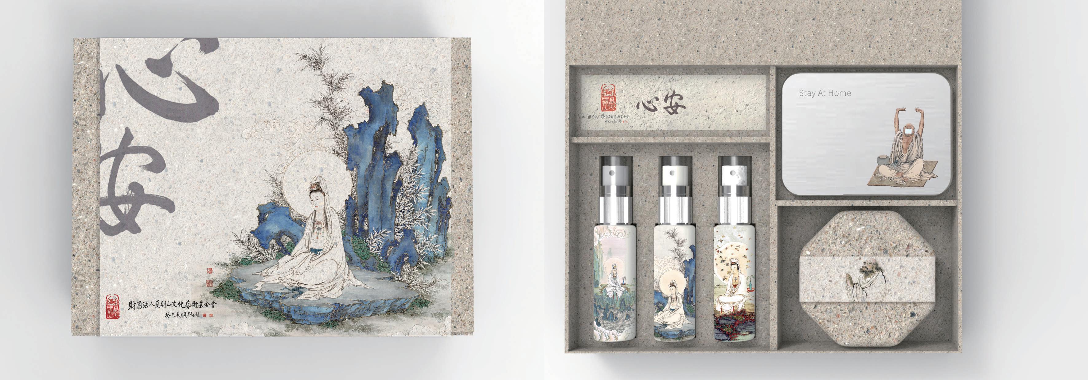 本禮盒材質選用環保再生紙,外包裝以青石觀音畫作與「心 安」的書法字呈現,希望收到此禮品的朋友,越用越心安。