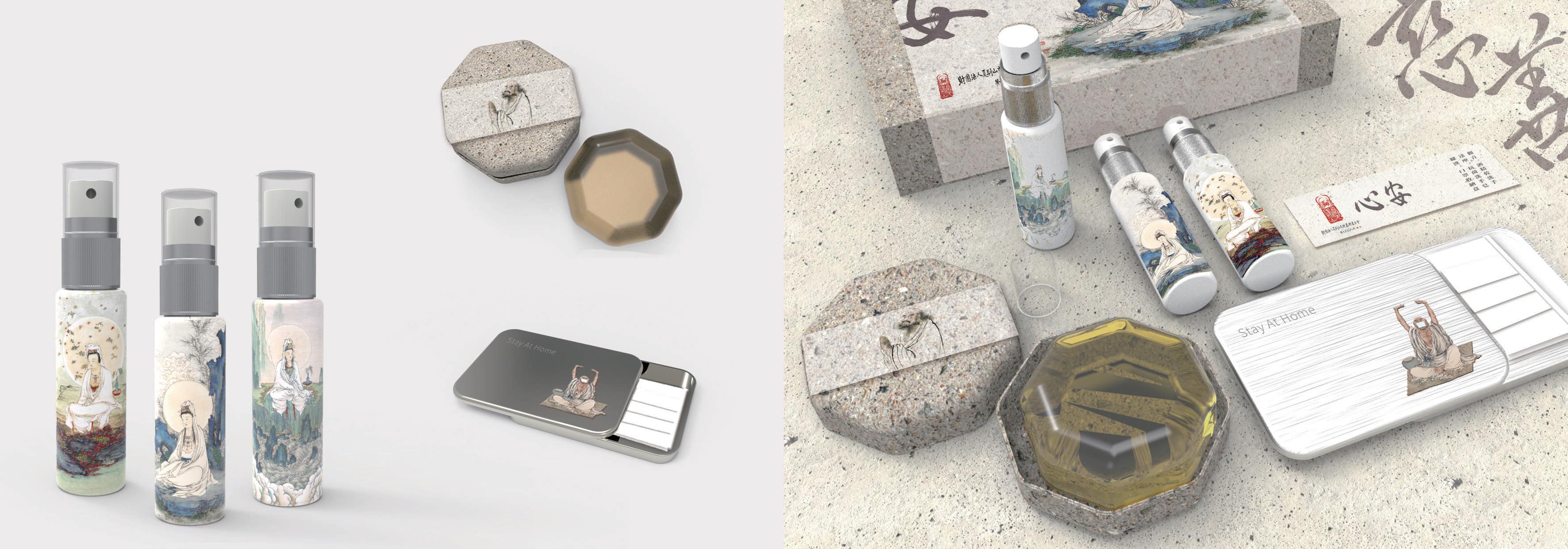 三幅觀音畫作設計在酒精噴霧瓶上,讓我們在使用 酒精消毒時,有一種被觀音菩薩保佑的意象。