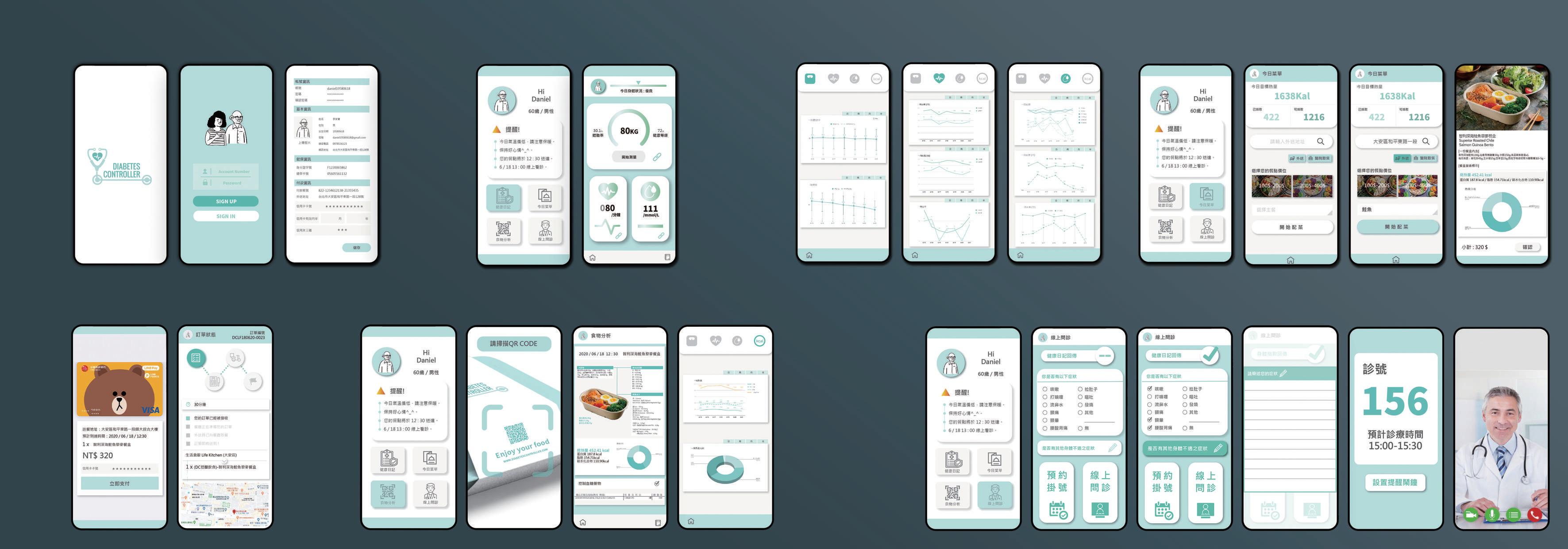 登入、 註冊介面 主頁、 功能介面 健康檢測 營養分析 飲食紀錄 健康數據 追蹤分析 付款、外送 訂單狀態