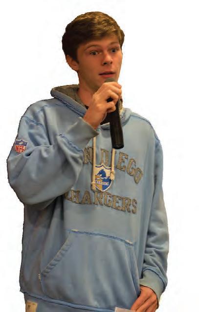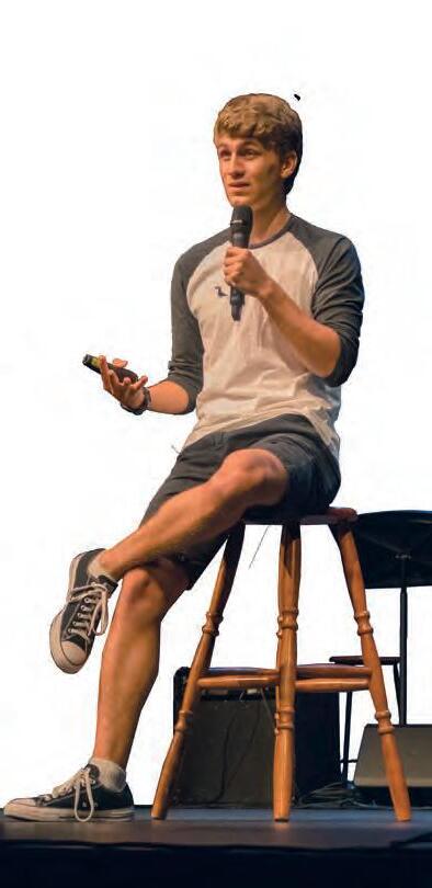 Holding the microphone in his hand, Gabe Roberts (12) lists off stereotypes that people have of new college students. In this exercise, students discussed what to expect when transitioning into a new place with new people, and they learned that people don’t always fit stereotypes.