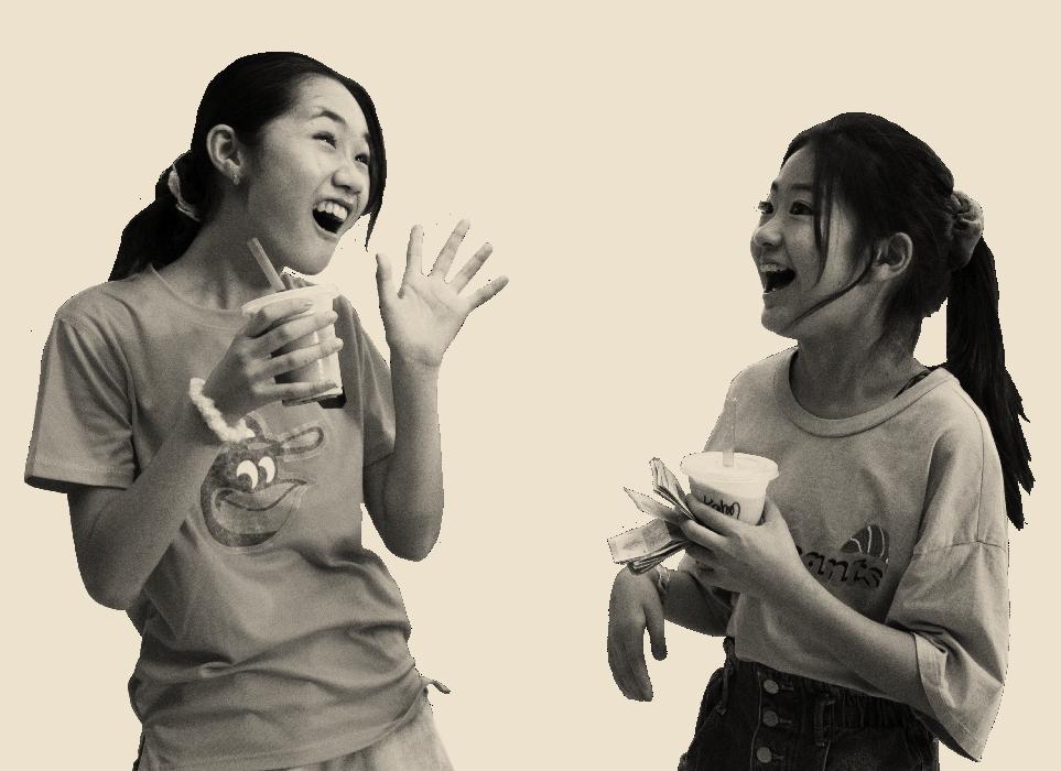 Holding drinks in their hands, Emilia Park (10) and Anya Kaloo (11) chat excitedly about Dolittle, the movie they planned to see. Students often picked up snacks at the shop outside the movie theater to enjoy while they watched a movie with their friends.