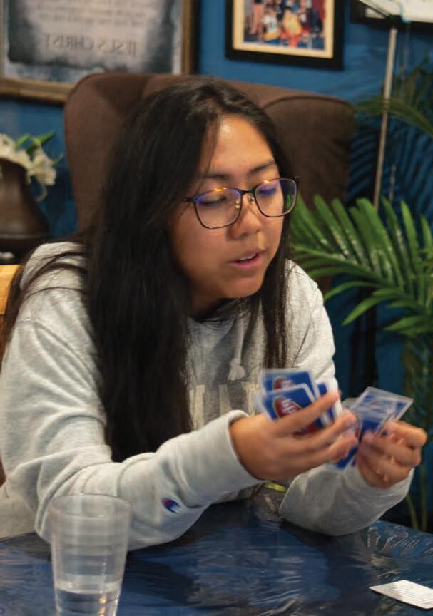 Arranging her cards carefully, Anya Kaloo (11) comes up with a strategy to win the next round of Phase 10, a card game similar to Uno. Dorm students had free time to bond with their dorm families through various community activities like board games and karaoke sessions.