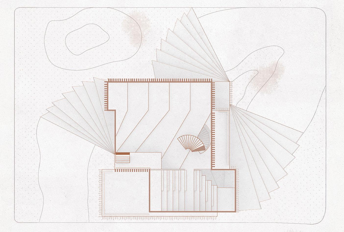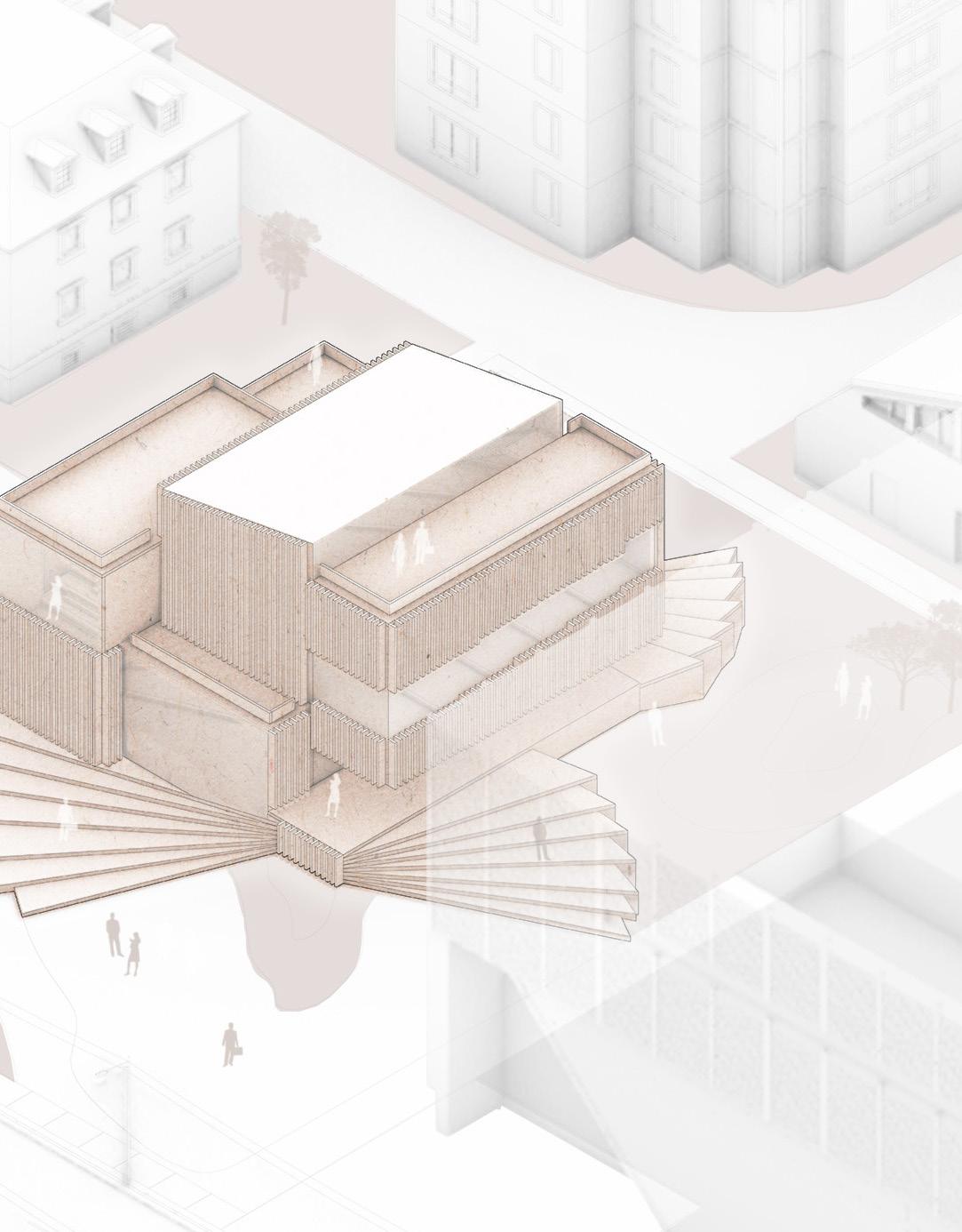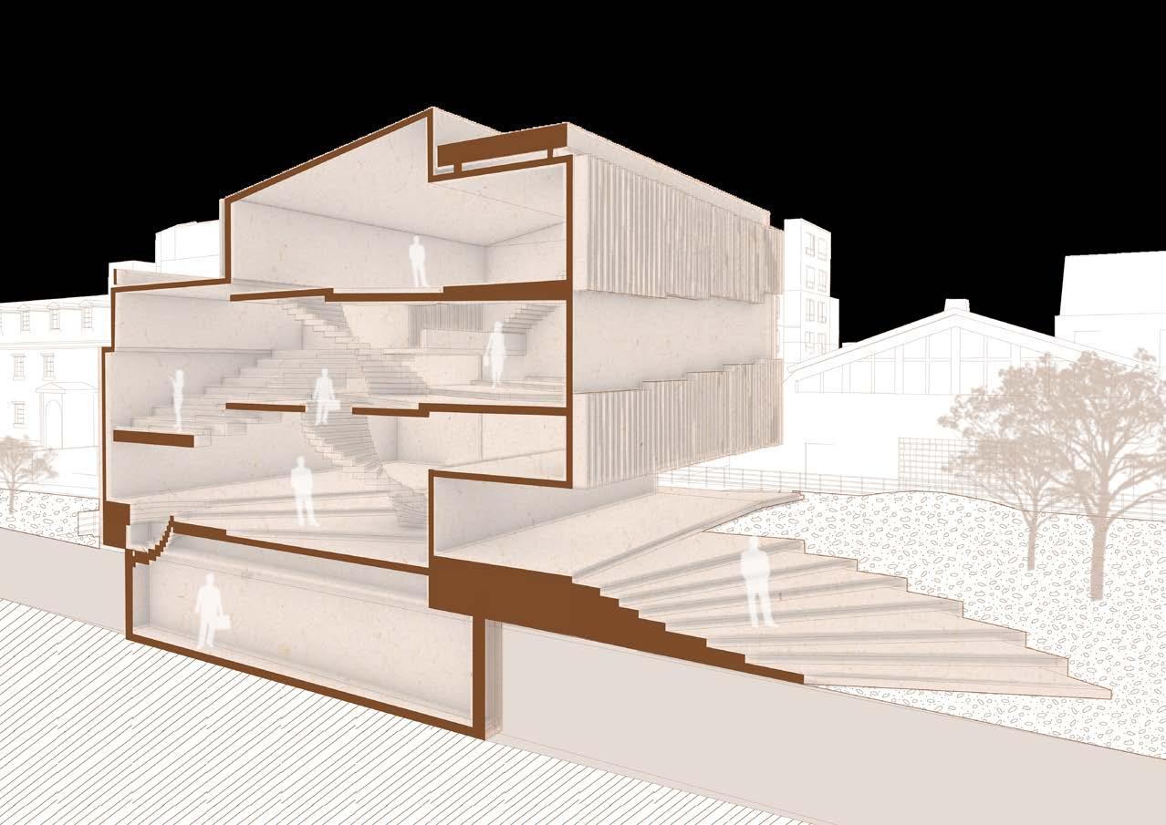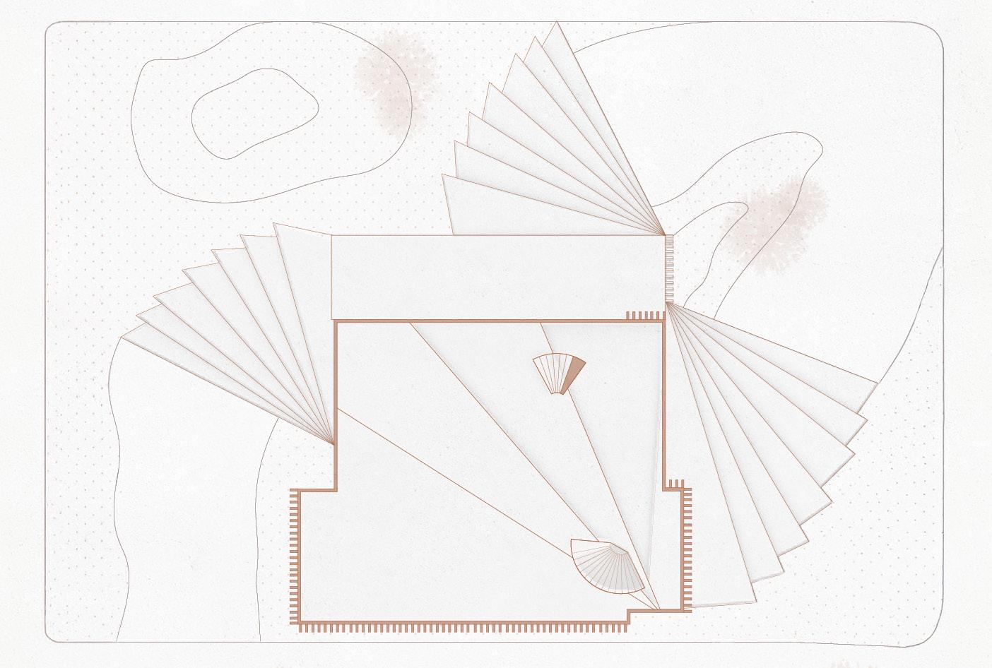 The following analysis (next page) shows all directional movements from each point in the diagram, inspiring the design of stairs and façade.