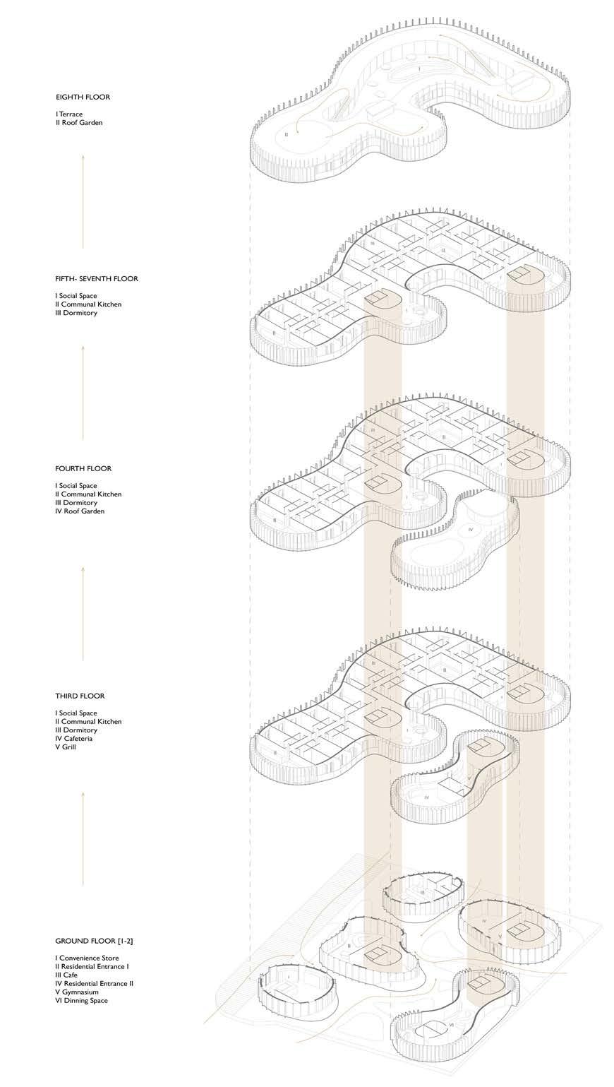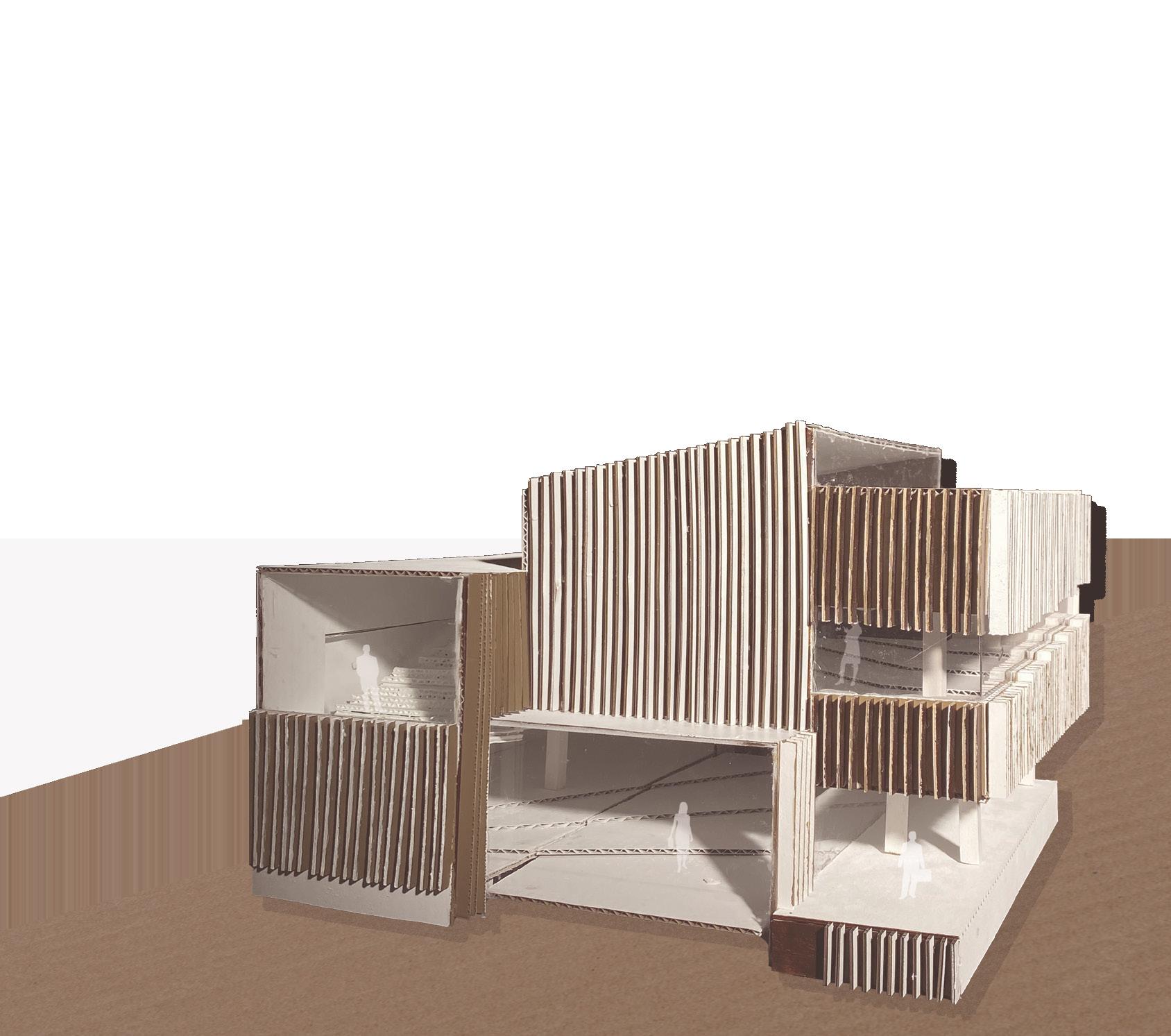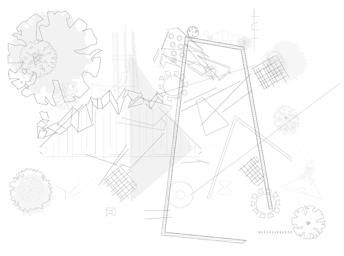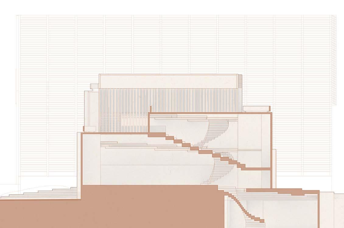 The following analysis (next page) shows all directional movements from each point in the diagram, inspiring the design of stairs and façade.