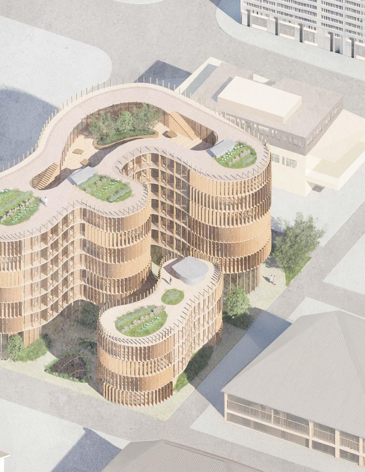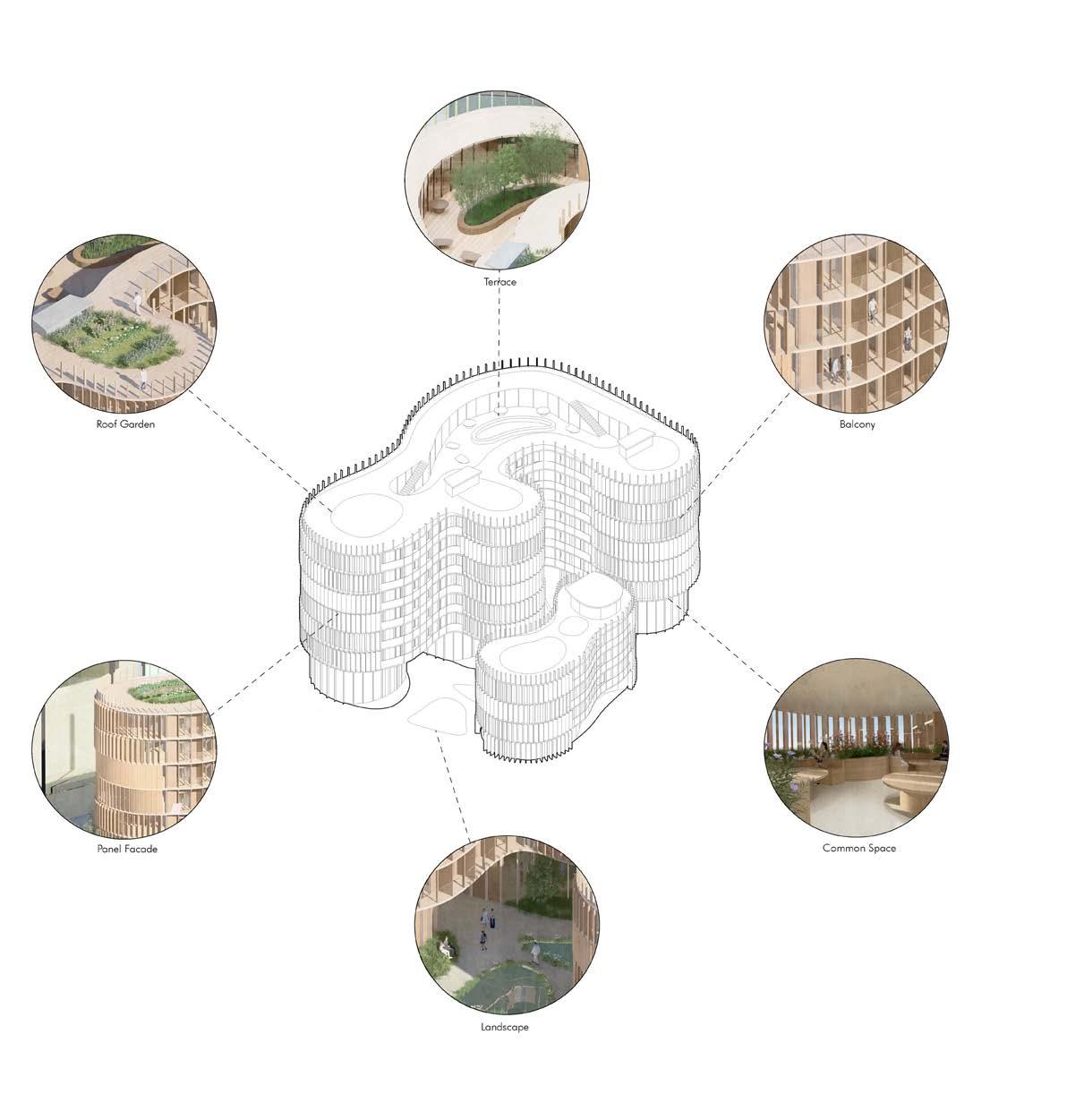 Embodying Sim Van der Ryn’s principles of empathic design, this student housing project places the inhabitant at the center of every design element. From the panel façade that adapts to sun exposure, to thoughtfully crafted balconies, common areas, landscape, and terraces, the design prioritizes student well-being. The existing building’s form adapts to the existing landscape, and the design creates a natural haven from the stressful university atmosphere.