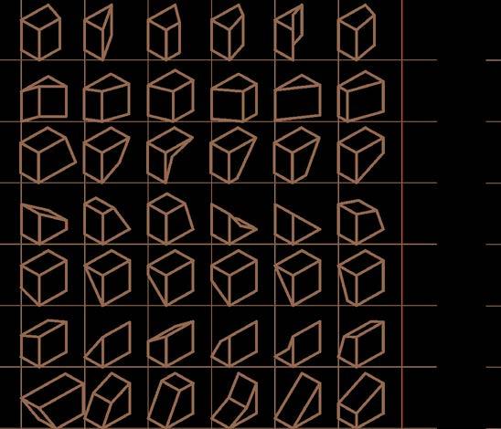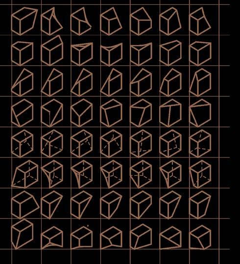 This cuboid analysis is a complete study of all forms transformed from a shift in a cube by moving its 6 faces, 12 vertices and 8 edges. It was used to generate the building form .