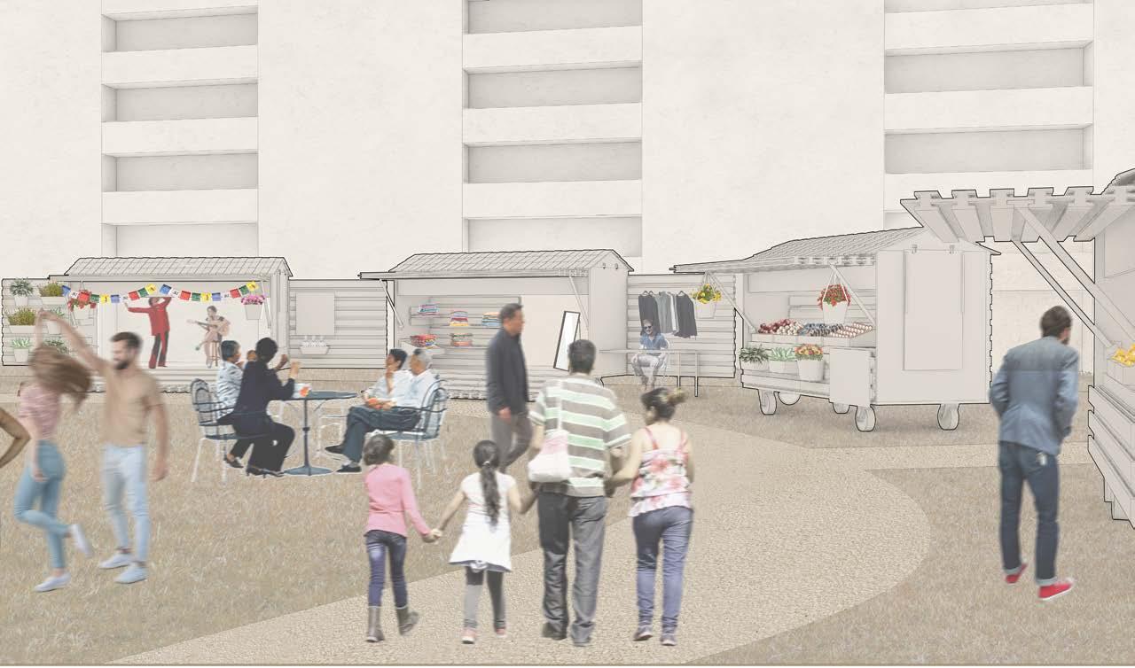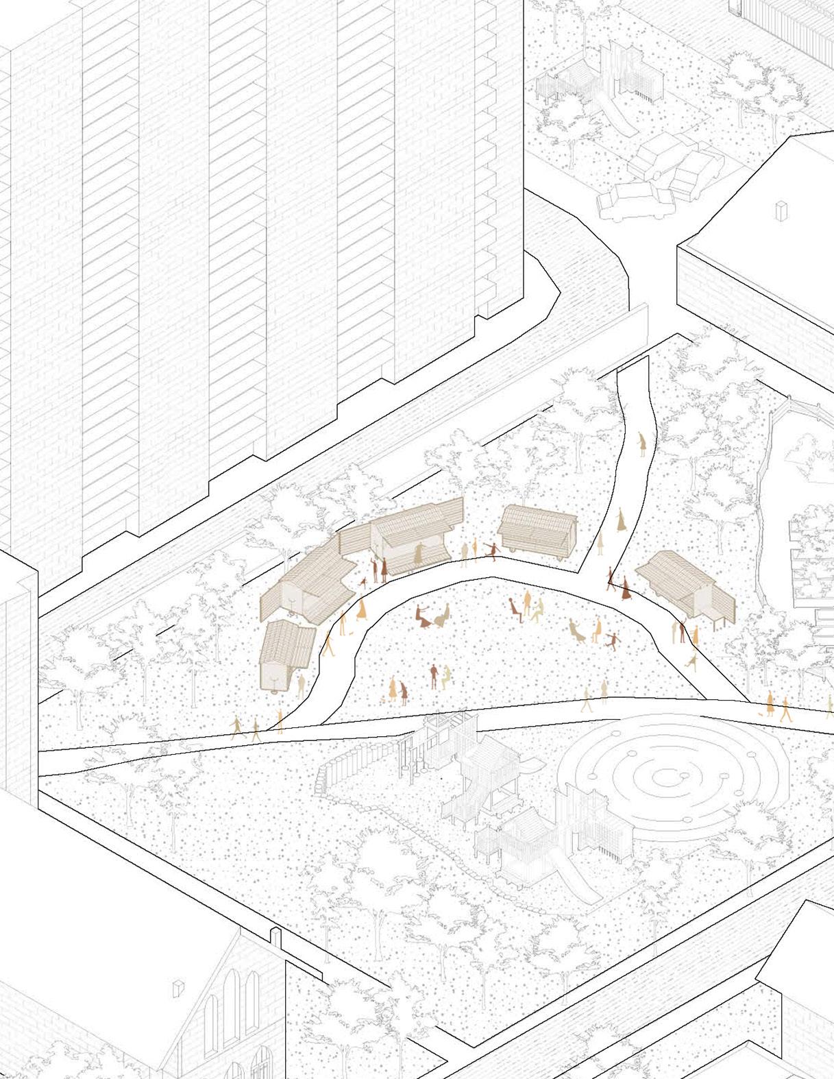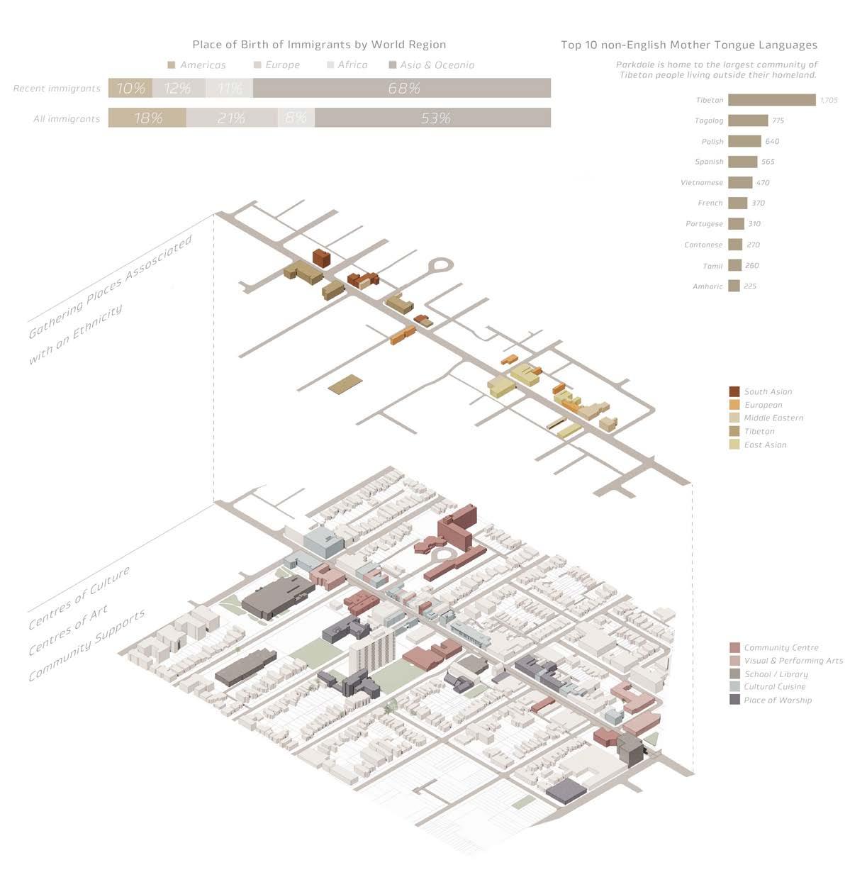 Parkdale, a vibrant multicultural hub in Toronto, often serves as a landing point for new immigrants. This research explores the cultural beacons within the community, highlighting its diversity and multiple ethnicities. The study of Masaryk Park led to a design intervention that expands its use, revitalizing the local farmer’s market. An alternative pathway and a newly designed cart were introduced to support the market’s growth that utilizes modular components and slide-in design to allow for flexible configurations based on specific needs.