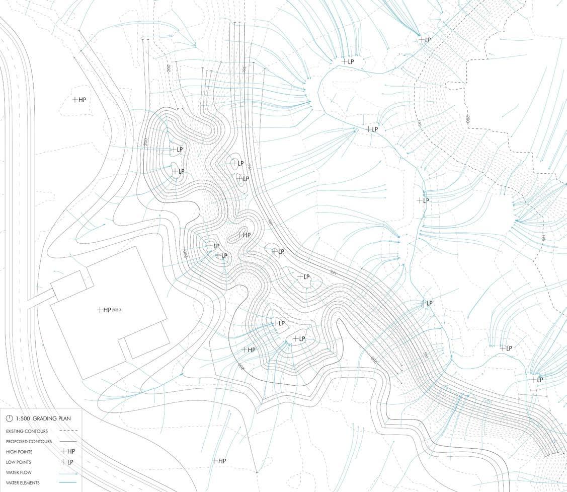 Based on the findings, a grading plan was developed to optimize drainage patterns for the new development and roads by extending the steep incline toward the watershed, incorporating two levels of retaining ponds, and designing two terraces within the first level near the development. This approach effectively slows water flow towards the river and away from the development, prevents soil erosion, and enhances the visual appeal of the surrounding landscape.