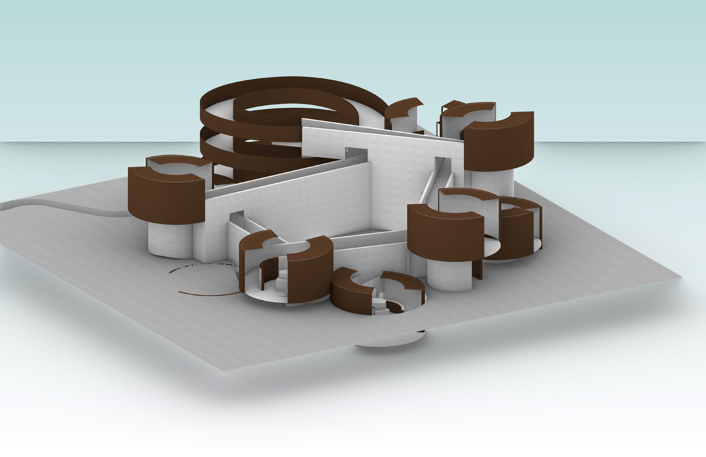 The final drawing best represented the idea of her inspiration. The pathway be gan low and went underground into a dark period of her life, where the “Mother and Child” sculpture will lie. Then it begins a slow climb with the ramps elevating higher until at the final central space, reaching the edge of the cliff. And finishing off seeing her last few pieces while taking a steeper ramp back to the ground.