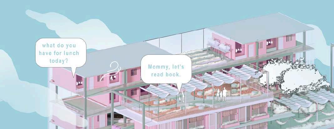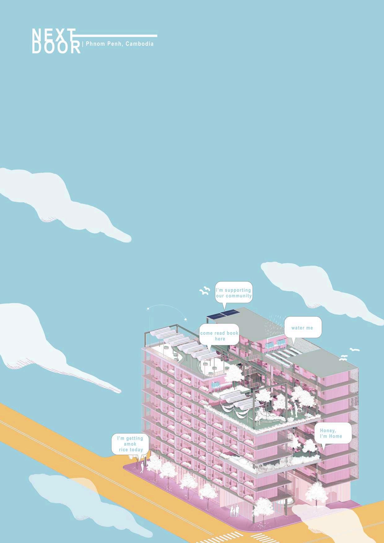 Next Door is multifunctional building and a home to more than one hundred families. Living in the central of the city, tenants got logical views on how they refused to move to bigger and better homes, while some struggle to move to a better place. Hence, improving the living conditions for them should be prioritized to design efficient space where they could called HOME. Within the building, three dimensional living is provided. Those include on land shophouse for commercial use, Communal space for our tenants and locals to spend their leisure time while getting socially connected and apartment. Accordingly, the project aims to improve and change the lifestyle of the current tenants for a healthy sustainable environment which could adapts to any circumstances in the future.