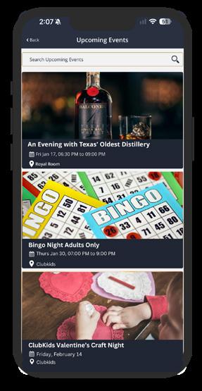 To register, select "Menu" from the home screen. Scroll down to the Social section and select "Upcoming Events". Select the event or search for an event. Registration can also be done online or with the Front Desk.