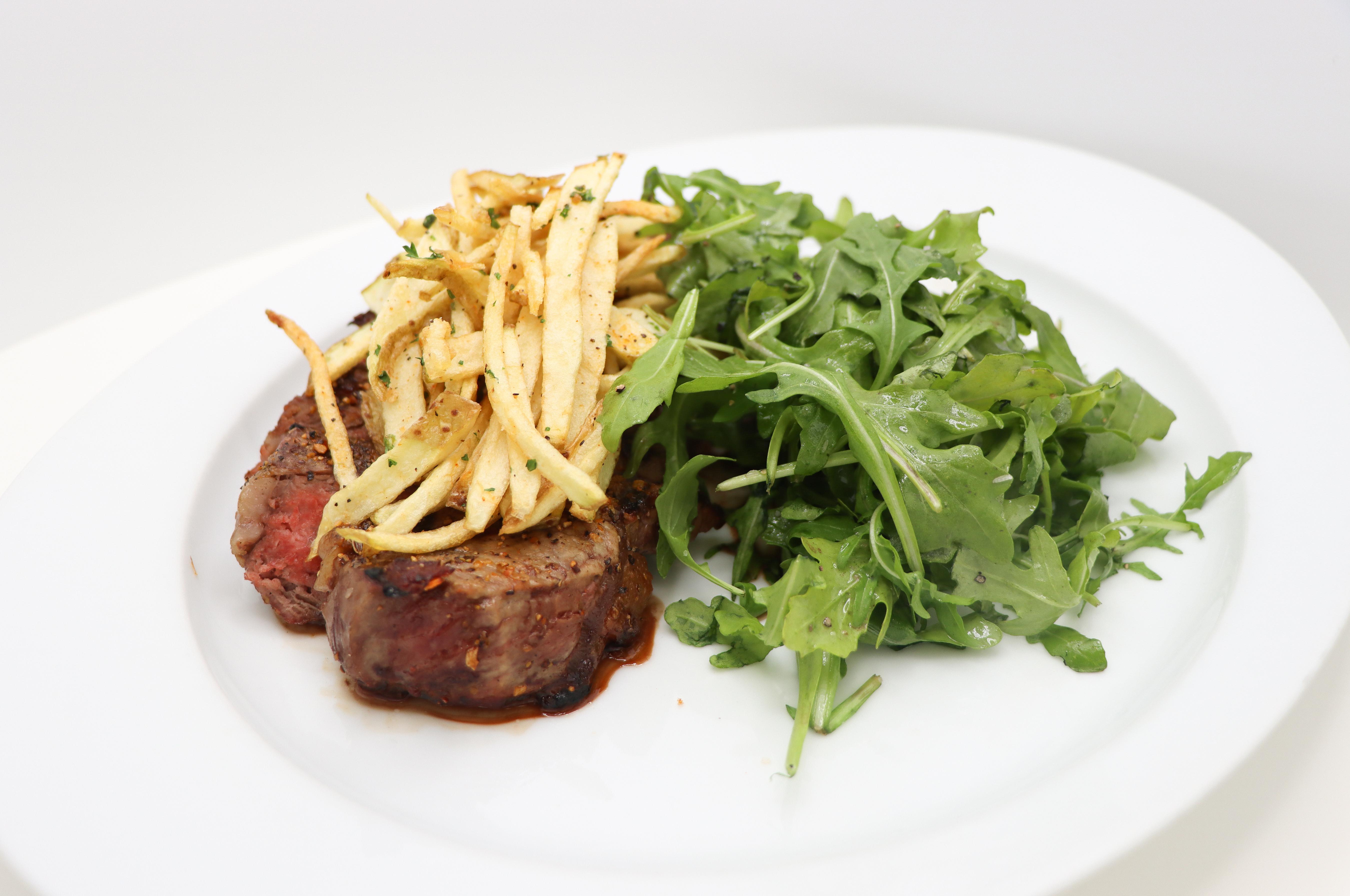 petite grilled strip steak with shoestring fries and a simple arugula salad