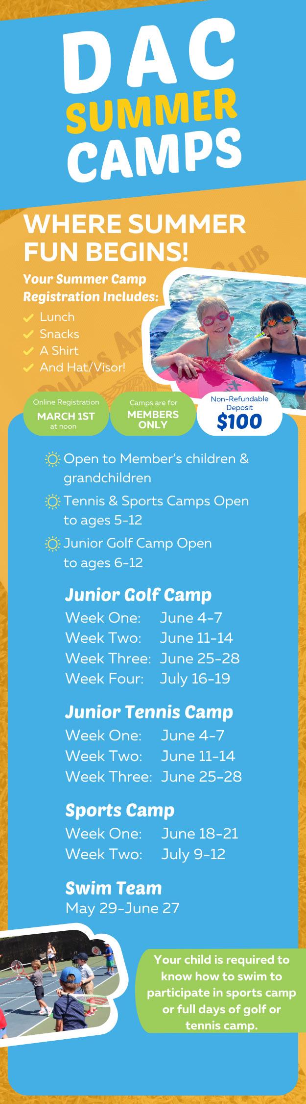 Last year, you found yourself enrolling them in DAC Summer Camp, and in the blink of an eye, you were assisting them with their college applications. Witnessing the growth of our youngest members within the Club remains a cherished aspect of the country club experience. The opportunity to register for Summer Camp has opened once again! Ensure that your DAC Profile is up to date with your dependents for a smoother sign-up process.