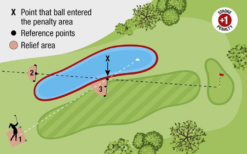 There is one notable difference between the options a player has when taking relief after hitting a ball into a red penalty area versus yellow. Red stakes allow players to also take lateral relief (up to two club-lengths no nearer the hole) from where the ball entered the penalty area in addition to returning to the spot from the previous shot and back-onthe-line relief where you can drop anywhere on an imaginary line drawn from the hole through the spot where the ball last crossed into the penalty area. The last two are the lone options if the penalty area is yellow.
