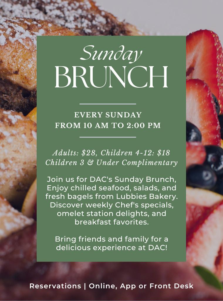 As the rainy days move out and summer moves in, the list of ways to socialize at our Club grows long: Trivia Night, Tennis 105, Music on the Lawn, summer camps and cooking classes; check out upcoming events on the DAC app and reserve your spot right away! Celebrating Mother’s Day and Father’s Day at the Club have become family traditions. Let our staff treat you and your family to fantastic fare on these occasions. Memorial Day weekend is the highly anticipated opening of the DAC swimming pool for the summer. The pool was resurfaced last month and new lounge and deck furniture is on the way. Poolside at DAC is the place to be this summer!