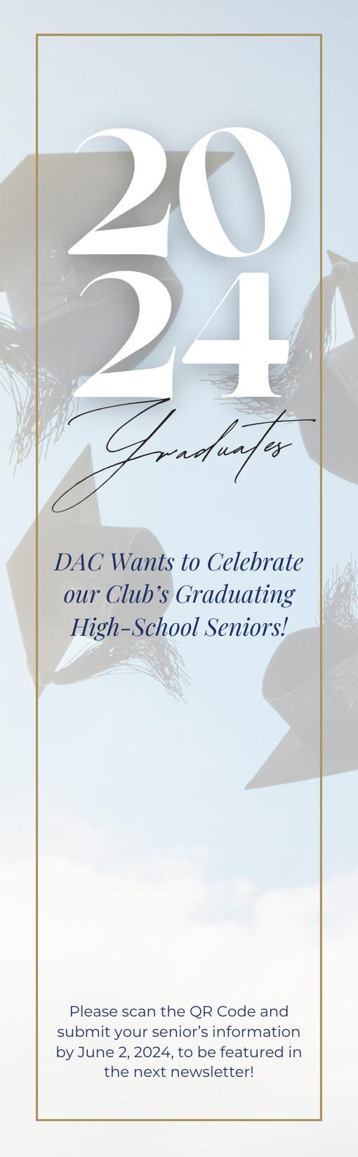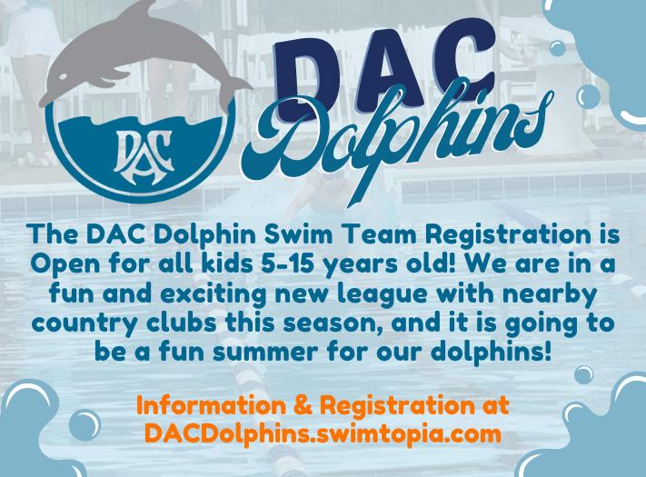 My favorite summertime activities at DAC include cheering on the DAC Dolphins swim team, celebrating our favorite moms and dads on Mother’s Day and Father’s Day, and my all-time favorite, our Annual 4th of July Celebration! As you read through this newsletter, make sure to SAVE THE DATE of your favorite events, because this summer will be one you don’t want to miss! I look forward to seeing you around the Club!