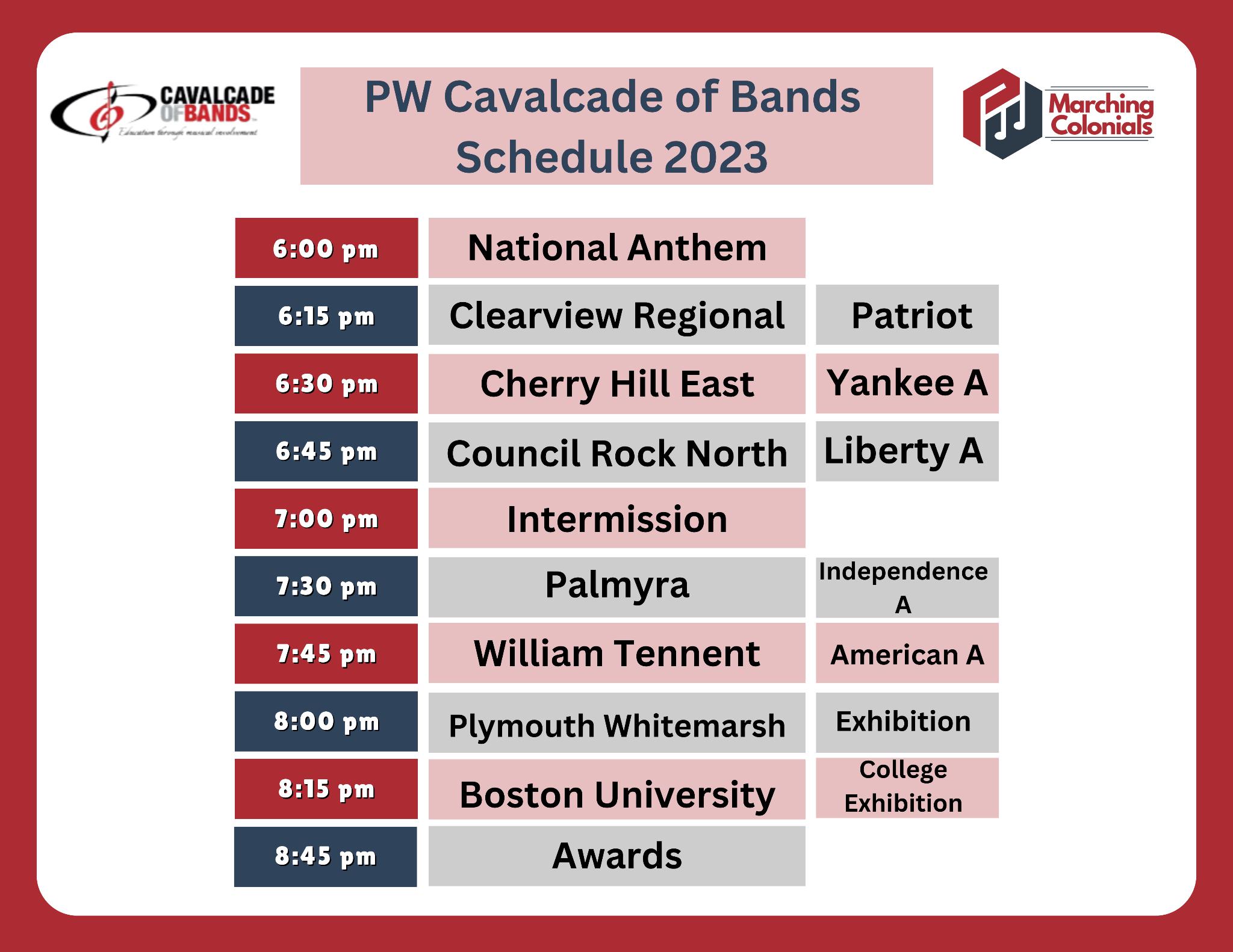 On behalf of the Plymouth Whitemarsh Marching Colonials and the Plymouth Whitemarsh Band Boosters, we want to welcome you to the 2023 Plymouth Whitemarsh Cavalcade of Bands. Tonight’s performances are a culmination of the hard work, dedication, and commitment of the students, directors, staff, and families of the bands. We are so thankful that you have decided to join us, and truly hope that you enjoy the show.
