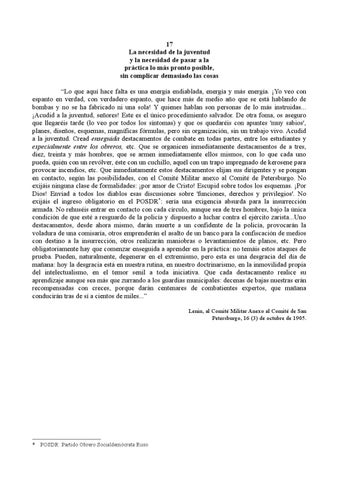 17 La necesidad de la juventud y la necesidad de pasar a la práctica lo más pronto posible, sin complicar demasiado las cosas “Lo que aquí hace falta es una energía endiablada, energía y más energía. ¡Yo veo con espanto en verdad, con verdadero espanto, que hace más de medio año que se está hablando de bombas y no se ha fabricado ni una sola! Y quienes hablan son personas de lo más instruidas... ¡Acudid a la juventud, señores! Este es el único procedimiento salvador. De otra foma, os aseguro que llegaréis tarde (lo veo por todos los síntomas) y que os quedaréis con apuntes 'muy sabios', planes, diseños, esquemas, magníficas fórmulas, pero sin organización, sin un trabajo vivo. Acudid a la juventud. Cread enseguida destacamentos de combate en todas partes, entre los estudiantes y especialmente entre los obreros, etc. Que se organicen inmediatamente destacamentos de a tres, diez, treinta y más hombres, que se armen inmediatamente ellos mismos, con lo que cada uno pueda, quién con un revólver, éste con un cuchillo, aquél con un trapo impregnado de kerosene para provocar incendios, etc. Que inmediatamente estos destacamentos elijan sus dirigentes y se pongan en contacto, según las posibilidades, con el Comité Militar anexo al Comité de Petersburgo. No exijáis ninguna clase de formalidades: ¡por amor de Cristo! Escupid sobre todos los esquemas. ¡Por Dios! Enviad a todos los diablos esas discusiones sobre 'funciones, derechos y privilegios'. No exijáis el ingreso obligatorio en el POSDR *: sería una exigencia absurda para la insurrección armada. No rehuséis entrar en contacto con cada círculo, aunque sea de tres hombres, bajo la única condición de que esté a resguardo de la policía y dispuesto a luchar contra el ejército zarista...Uno destacamentos, desde ahora mismo, darán muerte a un confidente de la policía, provocarán la voladura de una comisaría, otros emprenderán el asalto de un banco para la confiscación de medios con destino a la insurrección, otros realizarán maniobras o levantamientos de planos, etc. Pero obligatoriamente hay que comenzar enseguida a aprender en la práctica: no temáis estos ataques de prueba. Pueden, naturalmente, degenerar en el extremismo, pero esta es una desgracia del día de mañana: hoy la desgracia está en nuestra rutina, en nuestro doctrinarismo, en la inmovilidad propia del intelectualismo, en el temor senil a toda iniciativa. Que cada destacamento realice su aprendizaje aunque sea más que zurrando a los guardias municipales: decenas de bajas nuestras erán recompensadas con creces, porque darán centenares de combatientes expertos, que mañana conducirán tras de sí a cientos de miles...” Lenin, al Comité Militar Anexo al Comité de San Petersburgo, 16 (3) de octubre de 1905.