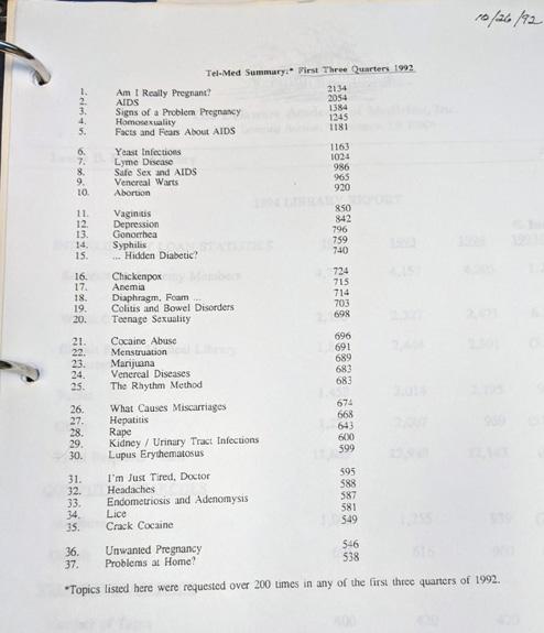 One of the most appealing features of Tel-Med was its anonymity. Callers had access to information that would answer sensitive questions they might otherwise be too embarrassed to ask. In the first three quarters of 1992 the top five tape requests were: 1) “Am I Really Pregnant?” (requested 2,134 times); 2) “AIDS” (2,054 times); 3) “Signs of a Problem Pregnancy” (1,384 times); 4) “Homosexuality” (1,245 times); and 5) “Facts and Fears about AIDS” (1,181 times) (figure 3). The information in each pre-recorded three to five-minutelong tape was written by physicians or other specialists on that topic. Tel-Med provided each subscribing organization with transcripts for review.
