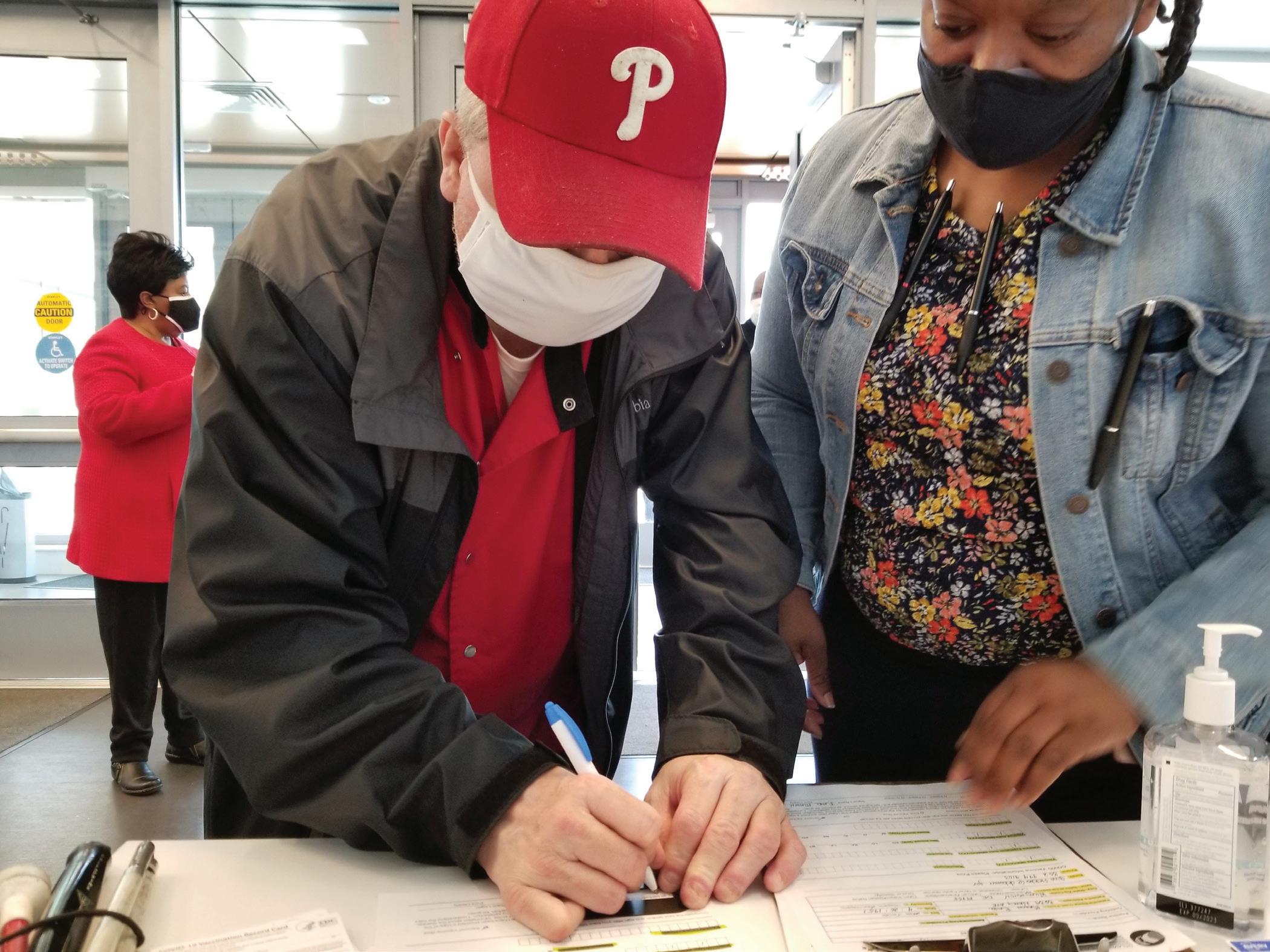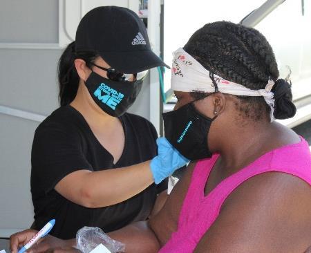 At left, Delaware National Guard (DNG) member Lixin Wang vaccinates Melissa D. at Whatcoat Village Apartments in Dover. The DNG and the Division of Public Health set up a mobile vaccination unit there on June 15
